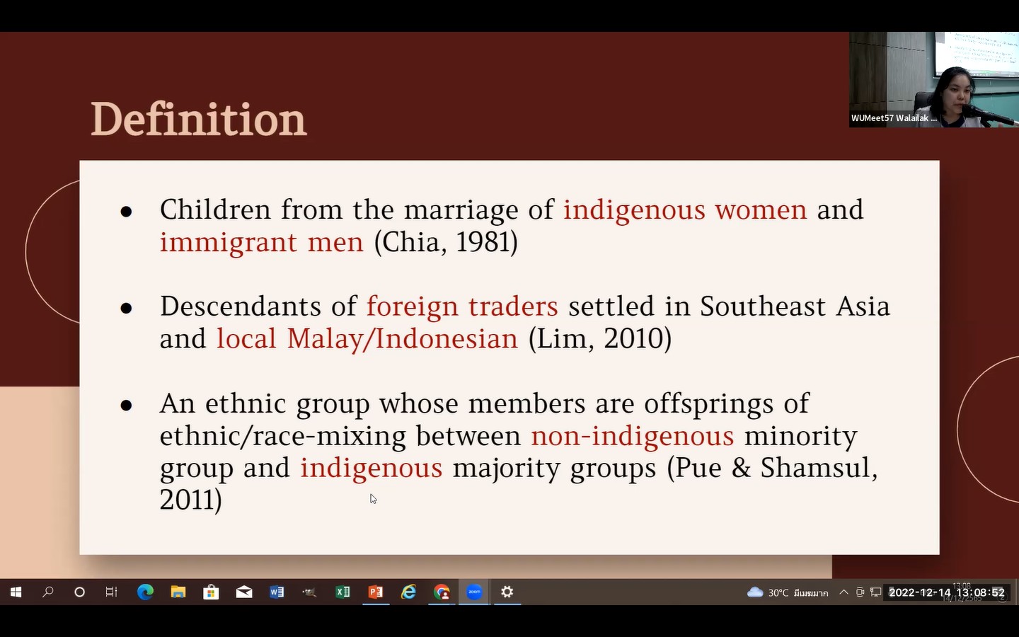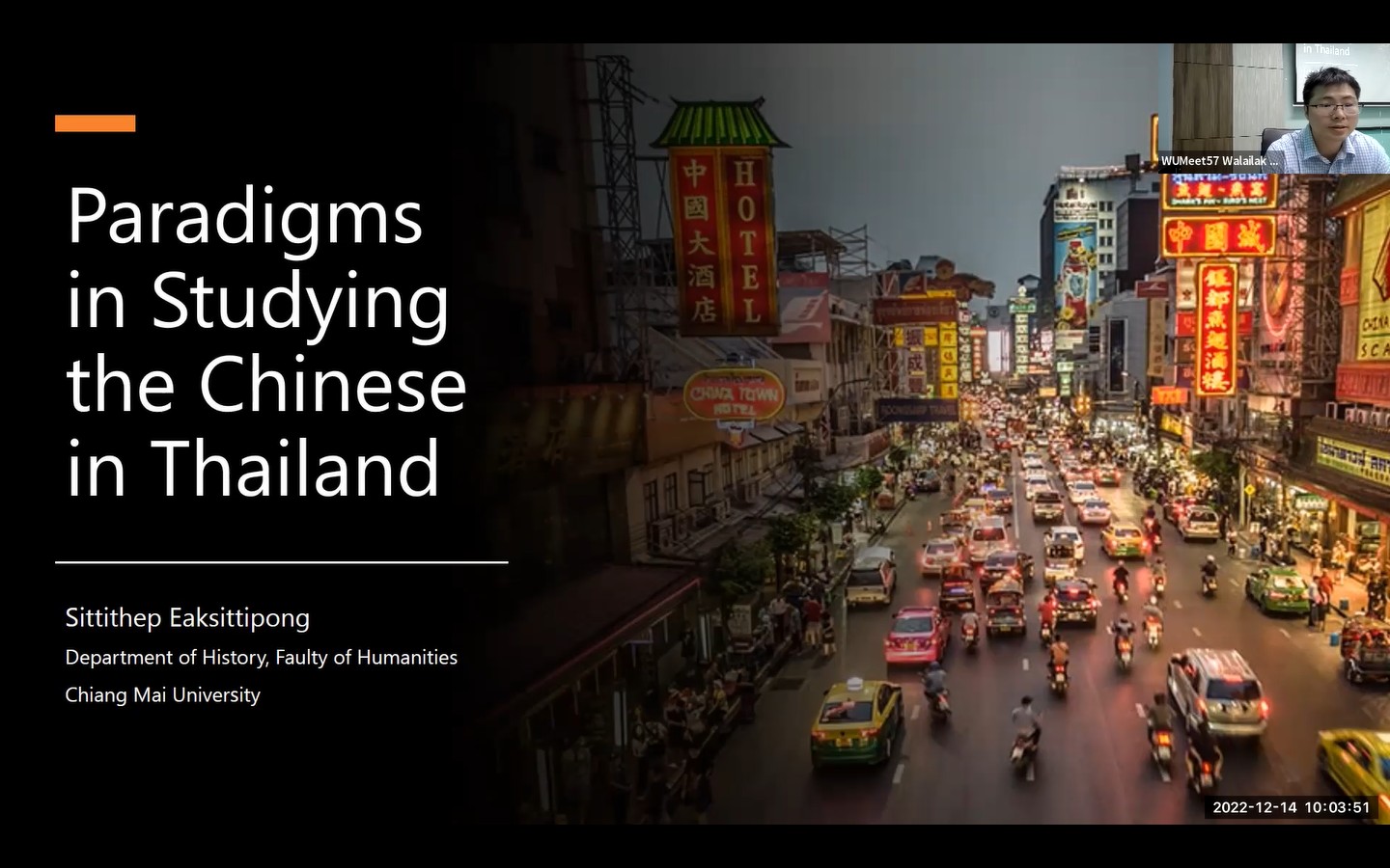 เมื่อวันพุธที่ 14 ธันวาคม 2565 เวลา 10.00 – 11.30 น. หลักสูตรปรัชญาดุษฎีบัณฑิต สาขาศิลปศาสตร์ (หลักสูตรนานาชาติ) ได้จัดกิจกรรมการบรรยาย หัวข้อ “Paradigms in Researching Chinese in Thailand” ณ ห้อง ST409 อาคารเรียนรวม 6 และออนไลน์ผ่านโปรแกรม Zoom วิทยากรโดยผู้ช่วยศาสตราจารย์ ดร. สิทธิเทพ เอกสิทธิพงษ์ หัวหน้าภาควิชาประวัติศาสตร์ คณะมนุษยศาสตร์ มหาวิทยาลัยเชียงใหม่ และในเวลา 13.00 – 15.00 น. ได้จัดกิจกรรมการรายงานความก้าวหน้าในการพัฒนาวิทยานิพนธ์ของนักศึกษาจำนวน 3 คน โดยนักศึกษาได้รับข้อคิดเห็นจากผู้ช่วยศาสตราจารย์ ดร. สิทธิเทพ เอกสิทธิพงษ์ และผู้ช่วยศาสตราจารย์ ดร.ฮารีซอล ขุนอินคีรี รวมถึงคณาจารย์ในหลักสูตร ซึ่งเป็นประโยชน์อย่างยิ่งในการพัฒนาวิทยานิพนธ์ต่อไป