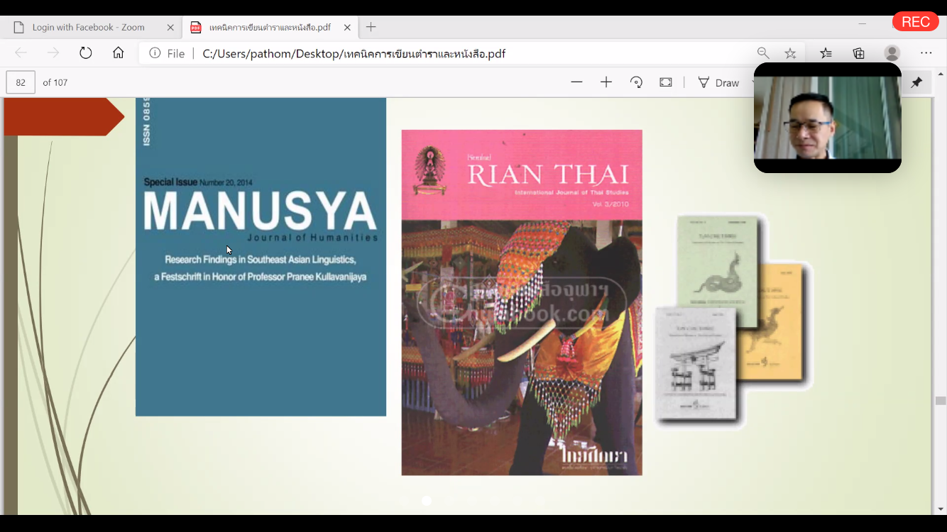 สถานวิจัย สำนักวิชาศิลปศาสตร์ จัดกิจกรรมบรรยายพิเศษหัวข้อ “กลยุทธ์พิชิตตำแหน่งศาสตราจารย์และการตีพิมพ์ผลงานในวารสาร Scopus/ISI” โดยวิทยากรคือ ศาสตราจารย์ ดร.ปฐม หงส์สุวรรณ อาจารย์ประจำภาควิชาภาษาไทยและภาษาตะวันออก คณะมนุษยศาสตร์และสังคมศาสตร์ มหาวิทยาลัยมหาสารคาม เมื่อวันพุธที่ 17 มิถุนายน 2563 เวลา 9.00-11.30 น. ณ ห้องประชุม 2 อาคารวิจัย มหาวิทยาลัยวลัยลักษณ์ และถ่ายทอดออนไลน์ผ่านโปรแกรม ZOOM มีผู้สนใจทั้งอาจารย์ นักวิชาการ และนักศึกษาบัณฑิตศึกษาเข้าร่วมกิจกรรมร่วม 30 คน