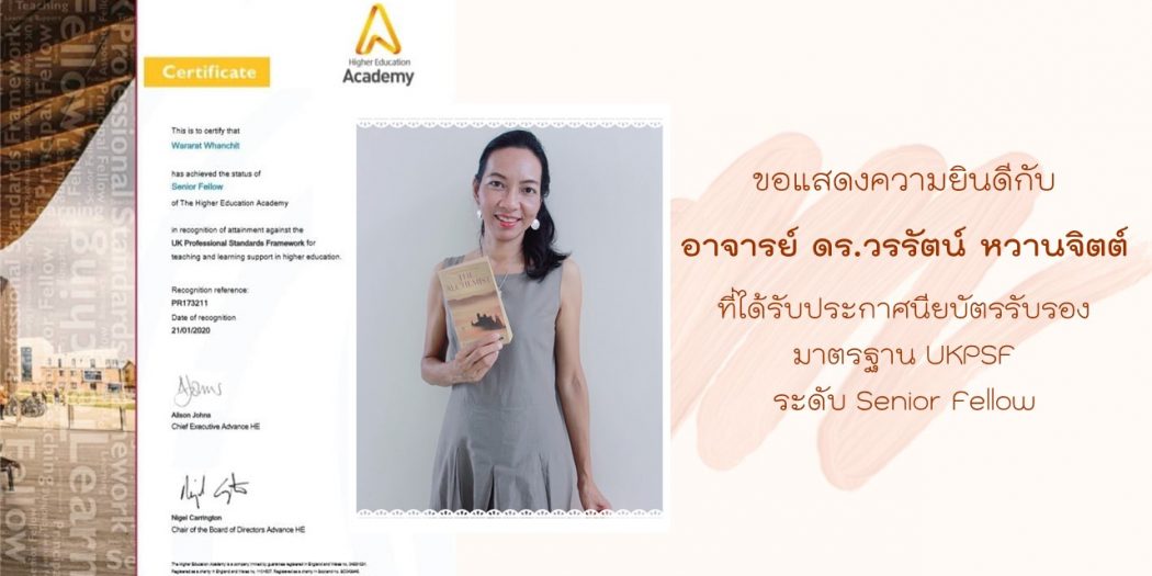 ขอแสดงความยินดีกับ อาจารย์ ดร.วรรัตน์ หวานจิตต์ ที่ได้รับประกาศนียบัตรรับรองมาตรฐาน UKPSF ระดับ Senior Fellow ซึ่งเป็นคนที่ 3 ของสำนักวิชาศิลปศาสตร์ คนแรก : อ.ดร.พัชรี อิ่มศรี และ คนที่ 2 : ผศ.ดร.สิริพร สมบูรณ์บูรณะ