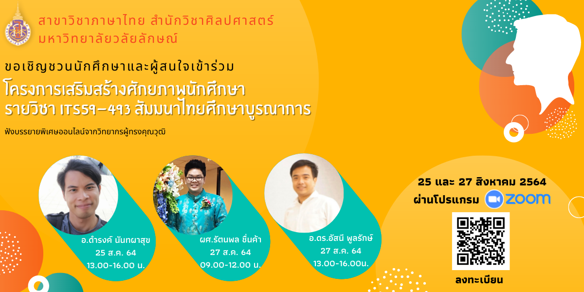 ขอเชิญฟังบรรยายพิเศษออนไลน์ “โครงการเสริมสร้างศักยภาพนักศึกษา รายวิชา ITS59-493 สัมมนาไทยศึกษาบูรณาการ” อ่านต่อ » สิงหาคม 18, 2021