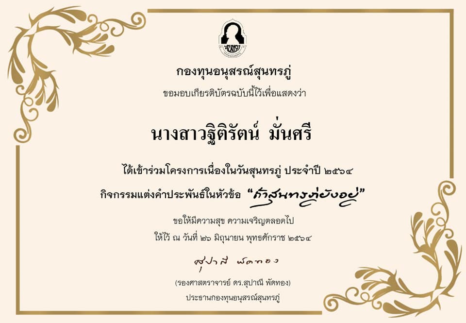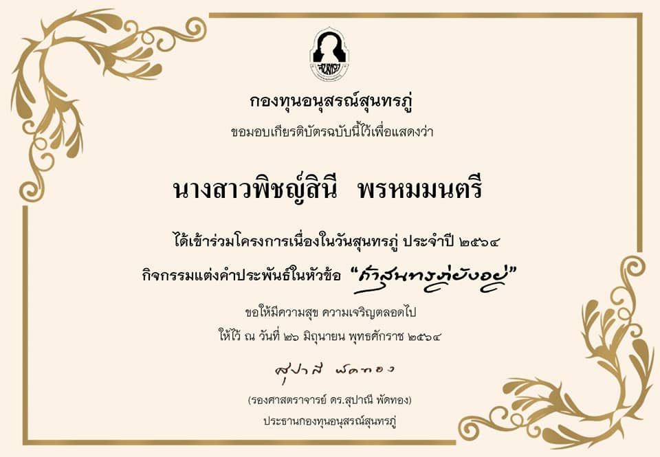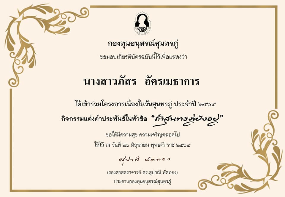 กองทุนอนุสรณ์สุนทรภู่ได้มอบเกียรติบัตรอิเล็กทรอนิกส์แก่ผู้เข้าร่วมโครงการแต่งคำประพันธ์ “ถ้าสุนทรภู่ยังอยู่” ประจำปี ๒๕๖๔ ในการนี้ สาขาวิชาภาษาไทย สำนักวิชาศิลปศาสตร์ มหาวิทยาลัยวลัยลักษณ์ ขอแสดงความยินดีแก่นักศึกษา #เอกไทยวลัยลักษณ์ ทั้งสี่คนที่เข้าร่วมกิจกรรมดังกล่าวมา ณ โอกาสนี้ด้วยครับ