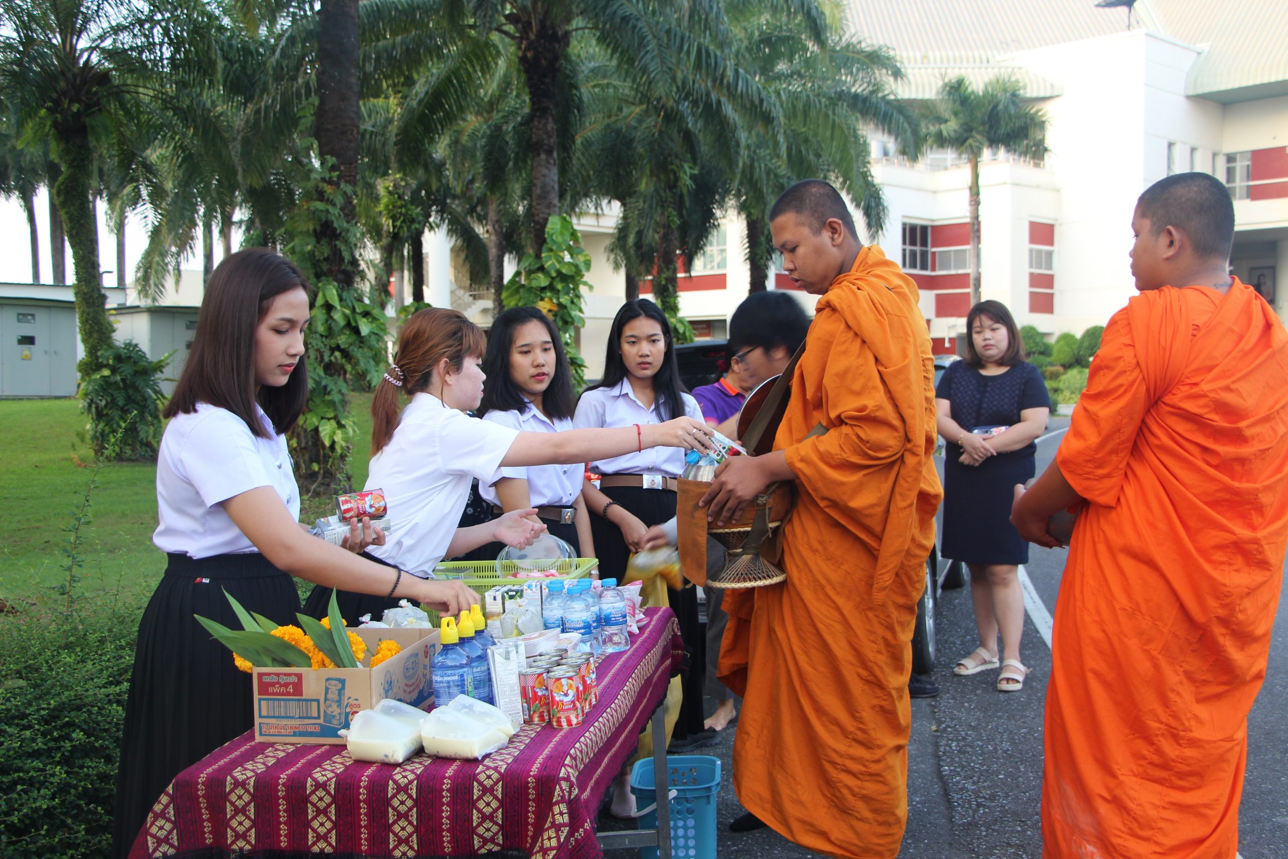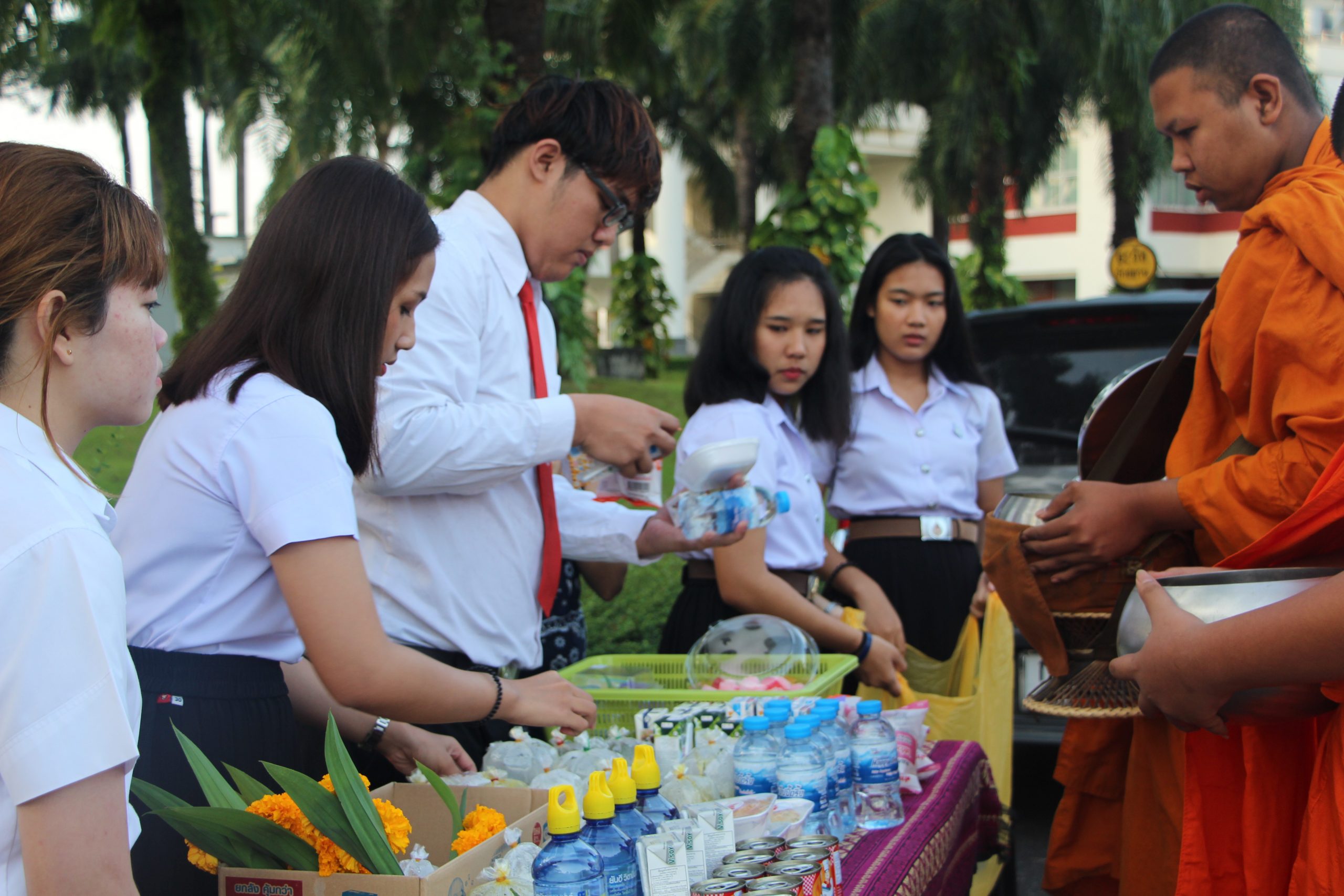 เมื่อศุกร์วันที่ 24 มกราคม 2563 หลักสูตรภาษาอังกฤษ (นานาชาติ) สำนักวิชาศิลปศาสตร์ ได้จัดกิจกรรมให้นักศึกษาในหลักสูตรพบอาจารย์ที่ปรึกษา โดยในช่วงเช้าระหว่างเวลา 7.00-8.00 น. ได้มีการตักบาตรร่วมกันระหว่างอาจารย์ นักศึกษา และบุคลากร ซึ่งนิมนต์มาจากวัดคลองดิน ด้านหน้าศาลท่านท้าวจตุคามรามเทพ และศาลทวดตุมปัง บริเวณข้างตึกไทยบุรี เพื่อเสริมสร้างการเรียนรู้เรื่องด้านการทำนุบำรุงศิลปวัฒนธรรม หลังจากเสร็จกิจกรรมการตักบาตรทางหลักสูตรได้มีการพบปะพูดคุยกับนักศึกษาในหลักสูตร ตลอดจนให้คำแนะนำในด้านการเรียนและเรื่องอื่นๆ ให้กับนักศึกษา นอกจากนี้ ผศ.ดร.ภัทร์นรินทร์ ศุภกร รองคณบดีสำนักวิชาศิลปศาสตร์และประธานหลักสูตรฯ ได้มอบรางวัลให้กับนักศึกษาที่มีผลการเรียนดีเยี่ยม 2 คน ได้แก่ นายศิวกร อักษรนำ และ นายวัศพล สถาพร ซึ่งได้เกรดเฉลี่ย 3.70 และ 3.55 โดยลำดับ