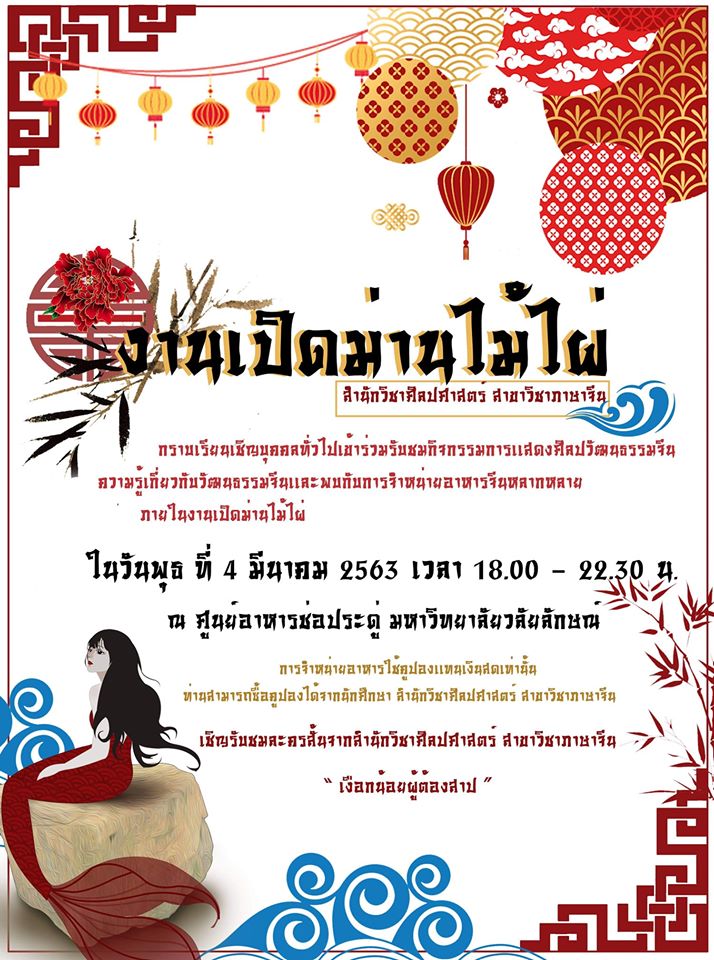 ขอเชิญชวนเข้าร่วมรับชมกิจกรรมการแสดงศิลปวัฒนธรรมจีน ความรู้เกี่ยวกับวัฒนธรรมจีน และพบกับการจำหน่ายอาหารจีนหลากหลาย ภายใน #งานเปิดม่านไม้ไผ่