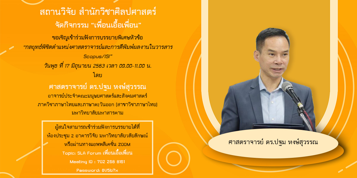 สถานวิจัย สำนักวิชาศิลปศาสตร์ จัดกิจกรรมบรรยายพิเศษหัวข้อ “กลยุทธ์พิชิตตำแหน่งศาสตราจารย์และการตีพิมพ์ผลงานในวารสาร Scopus/ISI” โดยวิทยากรคือ ศาสตราจารย์ ดร.ปฐม หงส์สุวรรณ อาจารย์ประจำภาควิชาภาษาไทยและภาษาตะวันออก คณะมนุษยศาสตร์และสังคมศาสตร์ มหาวิทยาลัยมหาสารคาม เมื่อวันพุธที่ 17 มิถุนายน 2563 เวลา 9.00-11.30 น. ณ ห้องประชุม 2 อาคารวิจัย มหาวิทยาลัยวลัยลักษณ์ และถ่ายทอดออนไลน์ผ่านโปรแกรม ZOOM มีผู้สนใจทั้งอาจารย์ นักวิชาการ และนักศึกษาบัณฑิตศึกษาเข้าร่วมกิจกรรมร่วม 30 คน