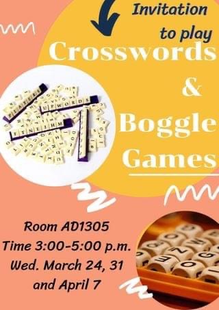 1. Crosswords and Boggle Games วันพุธ 24, 31 มี.ค. และ 7 เม.ย. เวลา 15.00-17.00 น. ห้อง AD1305 (ใครที่ยังเล่นไม่เป็นหรือไม่ถนัด จะมีการสอนให้ด้วยค่ะ)