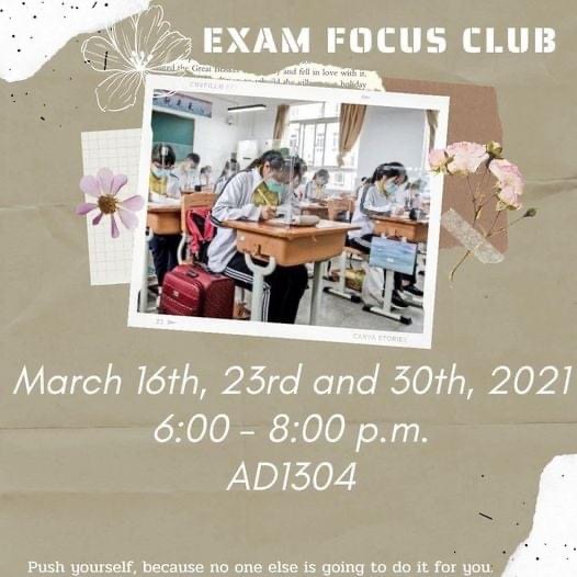 2. Exam Focus Club วันอังคาร 16, 23 และ 30 มี.ค. เวลา 18.00-20.00 น. ห้อง AD1304 (ฝึกทำข้อสอบ TOEIC, TOEFL และ IELTs เป็นต้น)