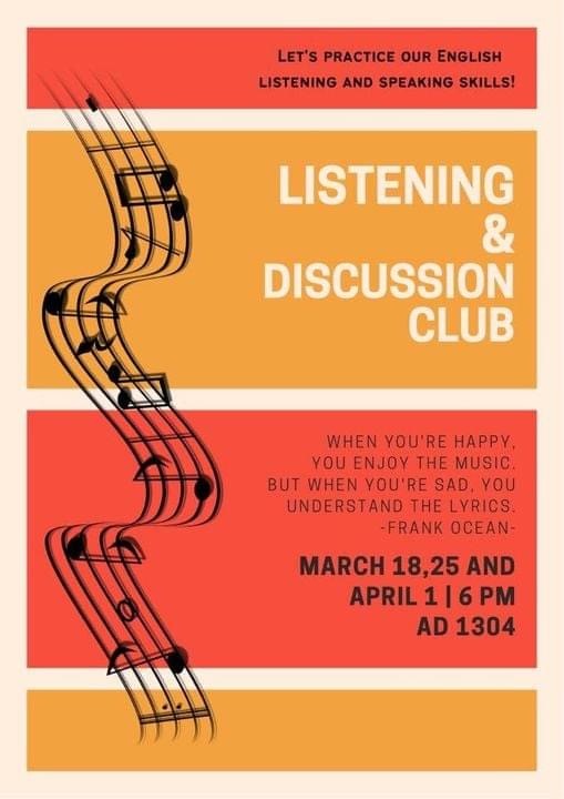 3. Listening and Discussion Club วันพฤหัสบดี 18, 25 มี.ค. และ 1 เม.ย. เวลา 18.00-20.00 น. ห้อง AD1304 (ฝึกฟังพูดจากเพลงและสื่อออนไลน์ต่างๆ)