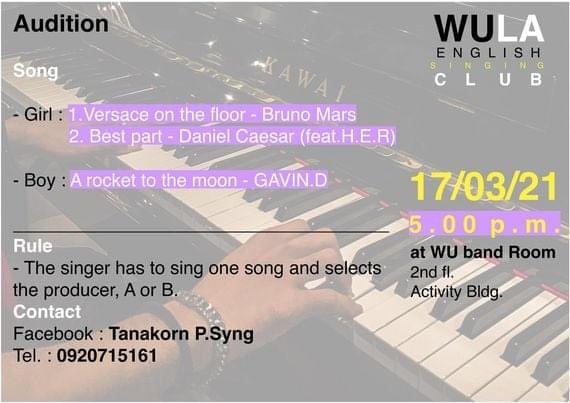 5. WULA English Singing Club วันพุธ 17, 24 และ 31 มี.ค. เวลา 17.00-19.00 น. ห้อง WU Band ชั้นสอง อาคารกิจกรรมนักศึกษา (นักศึกษาที่ชื่นชอบการร้องเพลง ดูรายละเอียดการ Audition ที่รูปเลยค่ะ)