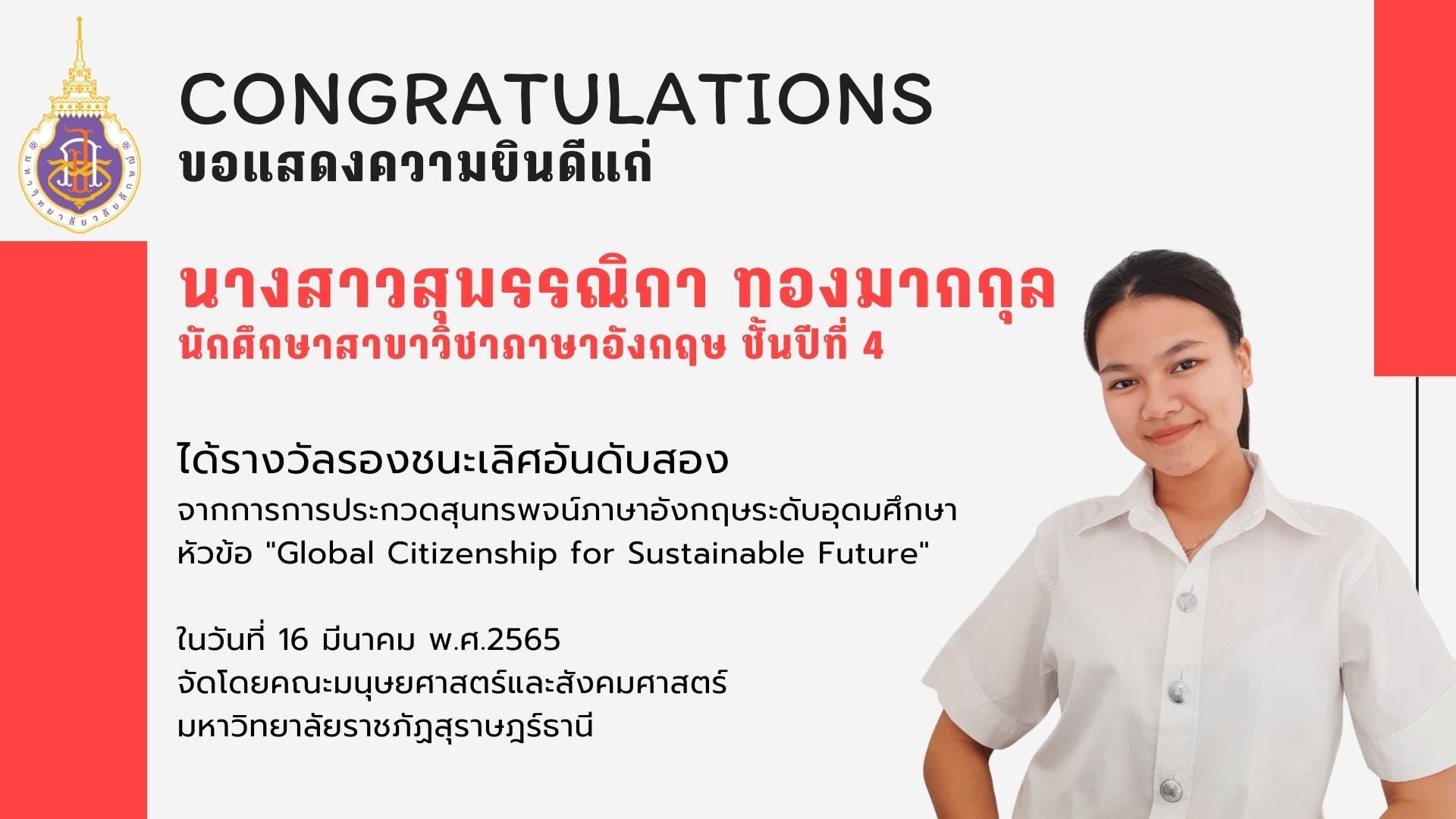 จากการประกวดในครั้งนี้ นางสาวสุพรรณิกา ทองมากกุล ได้รับรางวัลรองชนะเลิศอันดับ 2 นับเป็นความภาคภูมิในของสาขาวิชาฯ เป็นอย่างยิ่งที่นักศึกษาได้แสดงศักยภาพด้านภาษาอังกฤษให้เห็นเป็นที่ประจักษ์ต่อสาธารณชนตามพันธกิจของสาขาวิชาฯ