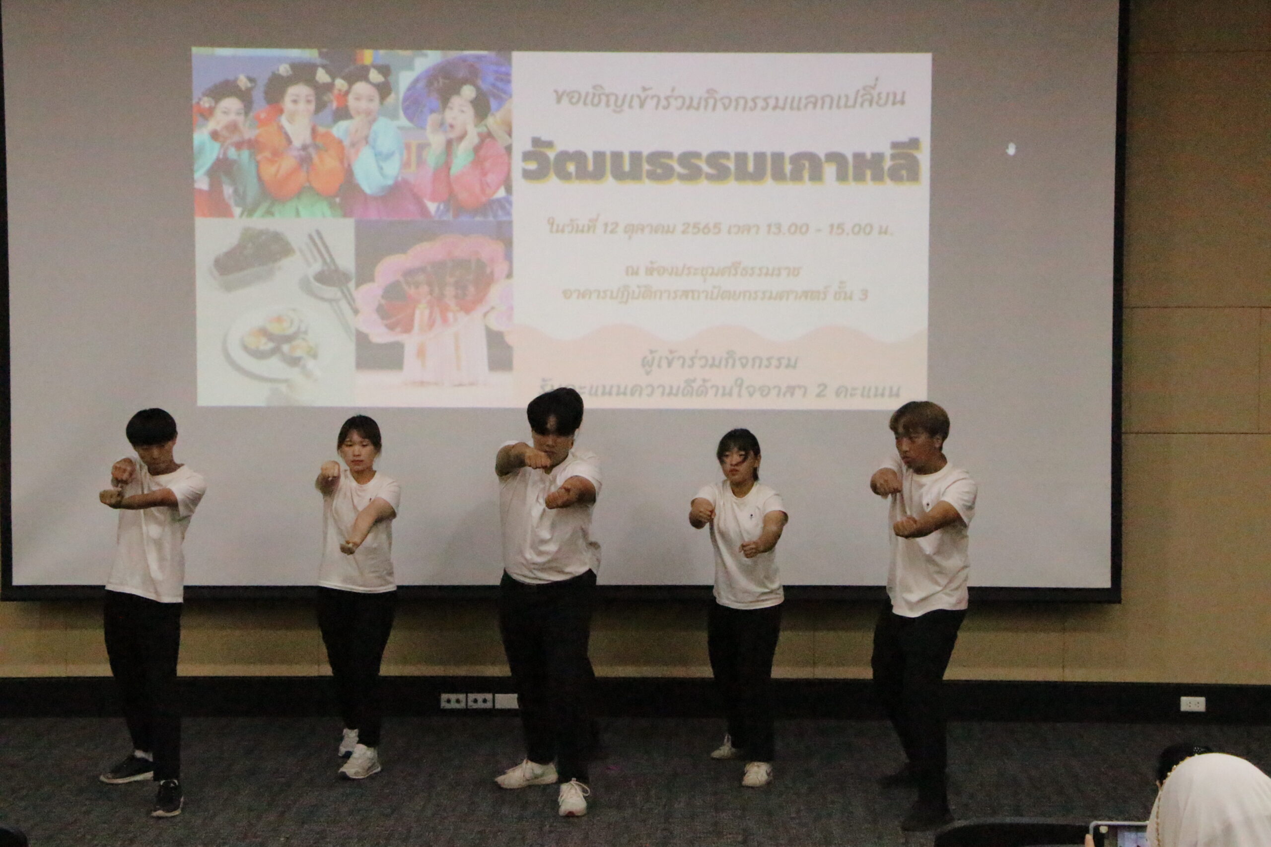 จากนั้นเป็นกิจกรรมการแสดงวัฒนธรรมของประเทศเกาหลีโดยนักศึกษาจากมหาวิทยาลัยนานาชาติ ณ เมืองเชจู ประเทศเกาหลีใต้ ได้แก่ การแสดงระบำพัดเกาหลี การเต้น Cover dance ผสมผสานกับศิลปะการป้องกันตัว การสอนแนะนำตัวเองเป็นภาษาเกาหลี และวัฒนธรรมการทำอาหารของประเทศเกาหลี การแต่งกายของด้วยชุดฮันบกชุดประจำชาติของประเทศเกาหลี ทั้งนี้กิจกรรมดังกล่าวได้จัดขึ้นจำนวน 2 รอบการแสดง นักศึกษาสามารถเข้าร่วมได้ครั้งละไม่เกิน 60 คน ซึ่งทั้ง 2 รอบการแสดงมีนักศึกษาให้ความสนใจเต็มจำนวนทุกรอบ