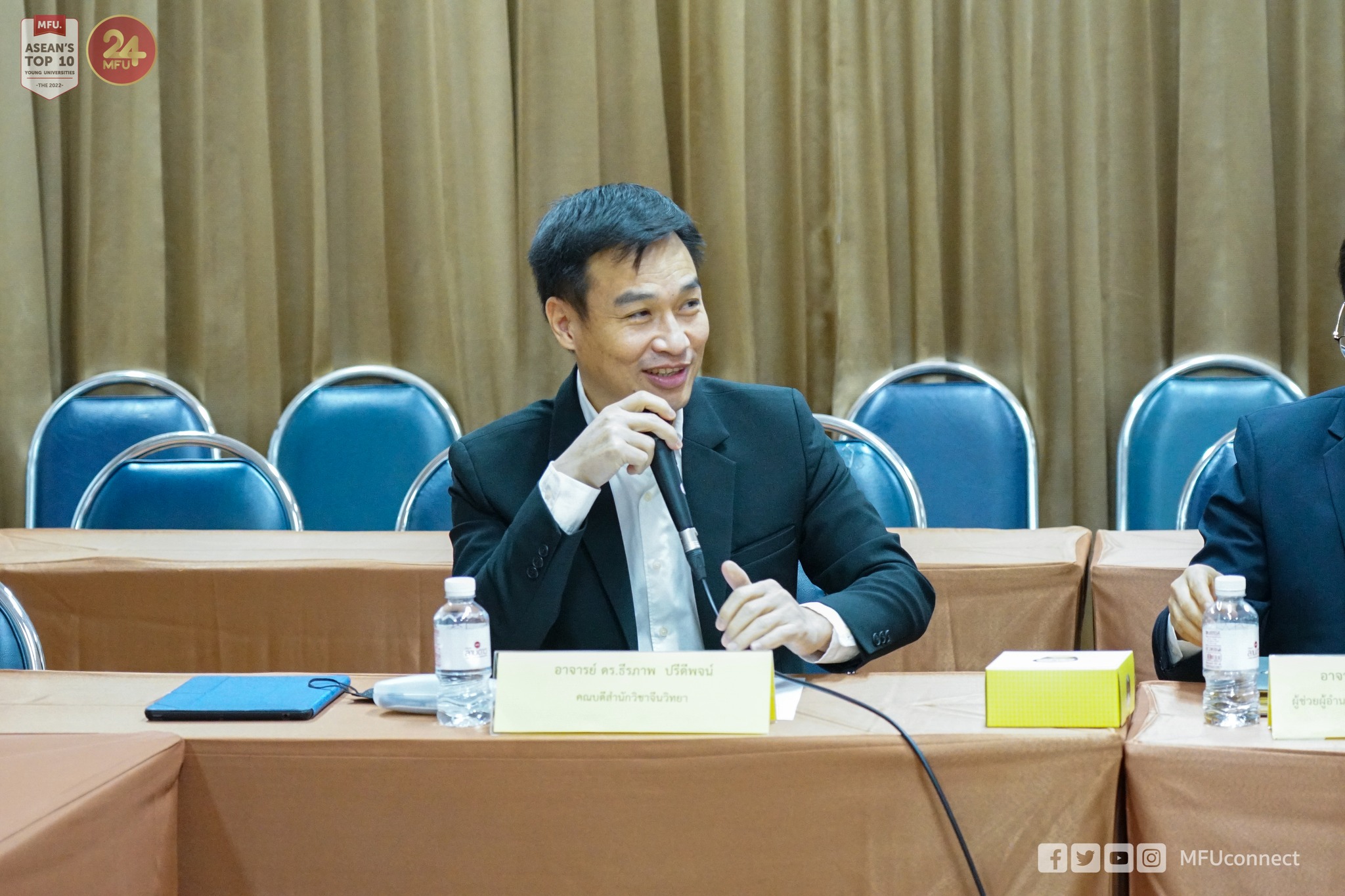 นอกจากนี้ ยังได้รับเกียรติจากอาจารย์ ดร.ธีรภาพ ปรีดิพจน์ คณบดีสำนักวิชาจีนวิทยา ให้คำแนะนำแนวทางการจัดตั้งและขับเคลื่อนศูนย์ภาษาและวัฒนธรรมจีน รวมทั้งแนะนำหลักสูตรในสำนักวิชาจีนวิทยา ร่วมด้วย
