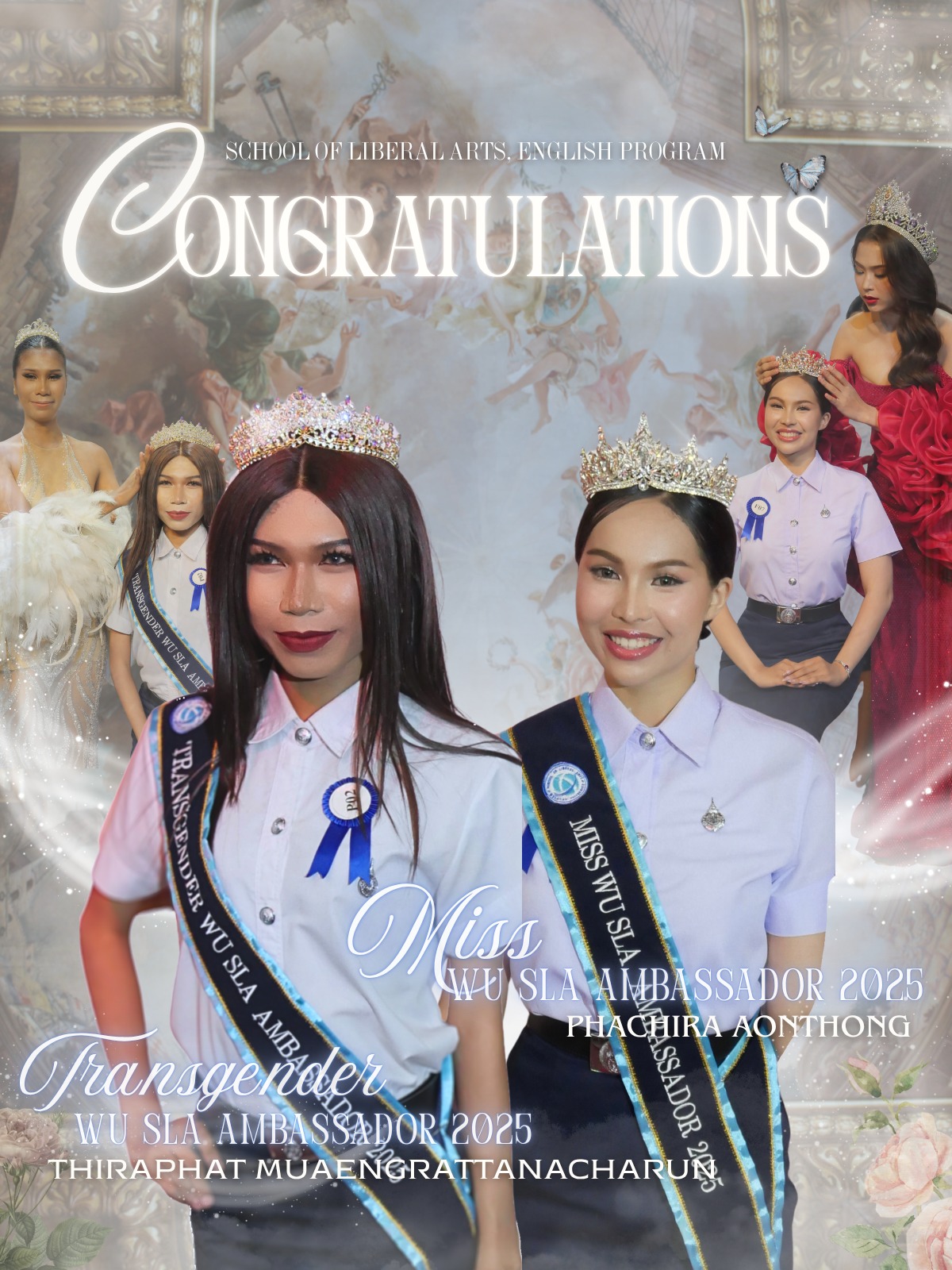 ประวัติศาสตร์ถูกสร้างขึ้นอีกครั้ง! ขอแสดงความยินดีกับ ภัชริยา อ่อนทอง – มิส WU SLA Ambassador 2025 และ ธิรภัทร ม่วงแรงธนชารุณ – Transgender WU SLA Ambassador 2025 ตัวแทนจาก หลักสูตรภาษาอังกฤษ สำนักวิชาศิลปศาสตร์ ทั้งสองได้สร้างความโดดเด่นบนเวที WU SLA Ambassador 2025 และคว้าตำแหน่งสูงสุดกลับบ้านแสงที่สว่างที่สุดไม่ใช่เพียงแค่ไฟบนเวที แต่คือแสงแห่งความมุ่งมั่น ความสามารถ และภาวะผู้นำที่แท้จริงที่ส่องประกายจากภายใน