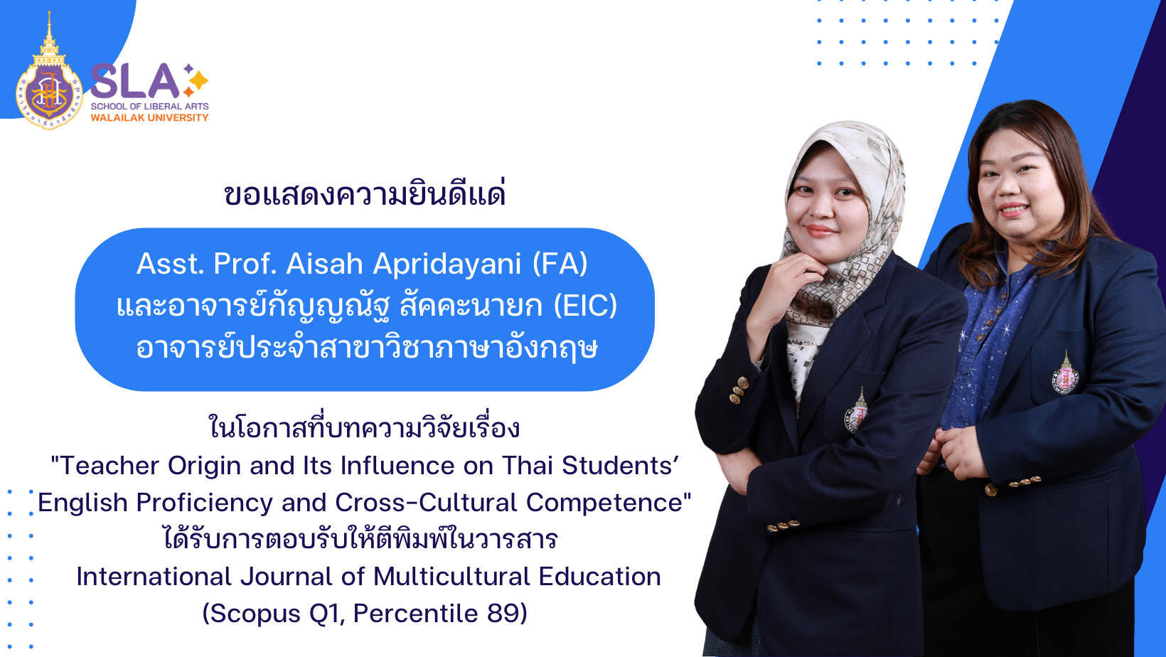 สาขาวิชาภาษาอังกฤษ สำนักวิชาศิลปศาสตร์ ขอแสดงความยินดีแด่ Asst. Prof. Aisah Apridayani (FA) และอาจารย์กัญญณัฐ สัคคะนายก (EIC) อาจารย์ประจำสาขาวิชาภาษาอังกฤษ ในโอกาสที่บทความวิจัยเรื่อง “Teacher Origin and Its Influence on Thai Students’ English Proficiency and Cross-Cultural Competence” ได้รับการตอบรับให้ตีพิมพ์ในวารสาร International Journal of Multicultural Education(Scopus Q1, Percentile 89)