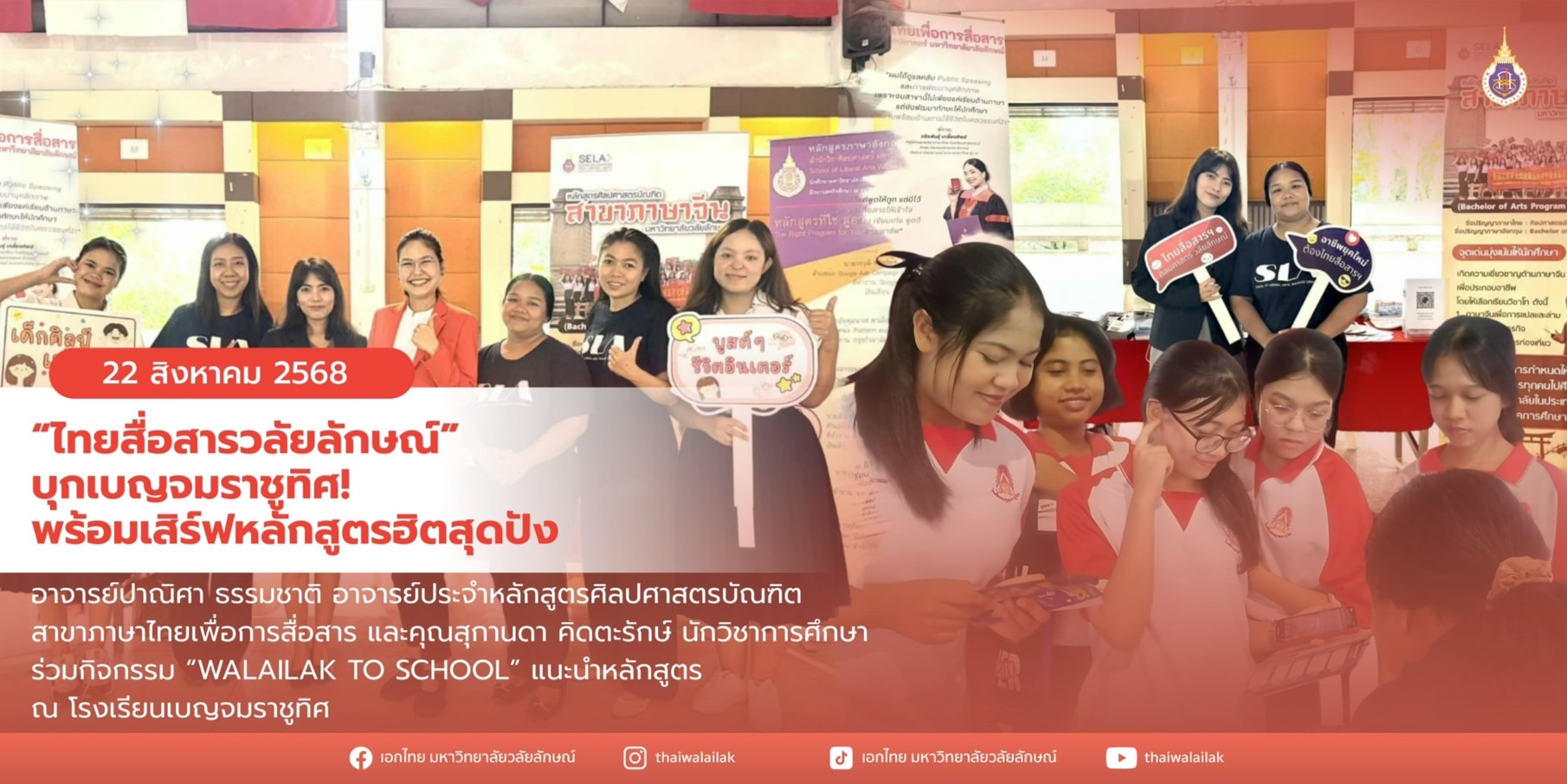 วันที่ 22 สิงหาคม 2568 มหาวิทยาลัยวลัยลักษณ์ นำทีมโดย รองศาสตราจารย์ ดร.สุรินทร์ ไหมศรีกรด รองอธิการบดี ดร.มงคล ธีระนานนท์ รองอธิการบดี ดร.ฟารีดา เจะเอาะ ผู้ช่วยอธิการบดีฝ่ายสื่อสารองค์กร ผู้บริหารและคณาจารย์จากทั้ง 17 สำนักวิชา จัดกิจกรรมแนะแนวการศึกษา “WALAILAK TO SCHOOL” ณ โรงเรียนเบญจมราชูทิศ จังหวัดนครศรีธรรมราช เพื่อแนะนำหลักสูตรและแนะแนวการศึกษาต่อให้น้องๆ ม.ปลาย งานนี้ อาจารย์ปาณิศา ธรรมชาติ อาจารย์ประจำหลักสูตรศิลปศาสตรบัณฑิต สาขาภาษาไทยเพื่อการสื่อสาร และคุณสุกานดา คิดตะรักษ์ นักวิชาการศึกษา ได้นำข้อมูลเกี่ยวกับหลักสูตรภาษาไทยเพื่อการสื่อสาร ไปประชาสัมพันธ์ให้กับน้องๆ จากโรงเรียนมัธยมศึกษาชั้นนำในจังหวัดนครศรีธรรมราช บรรยากาศเต็มไปด้วยความอบอุ่นและความสนุกสนานจากกิจกรรมที่รุ่นพี่สำนักวิชาศิลปศาสตร์ขนมาให้น้องๆ ได้ร่วมเล่น พร้อมพูดคุยและตอบคำถามกับน้องๆ อย่างใกล้ชิด