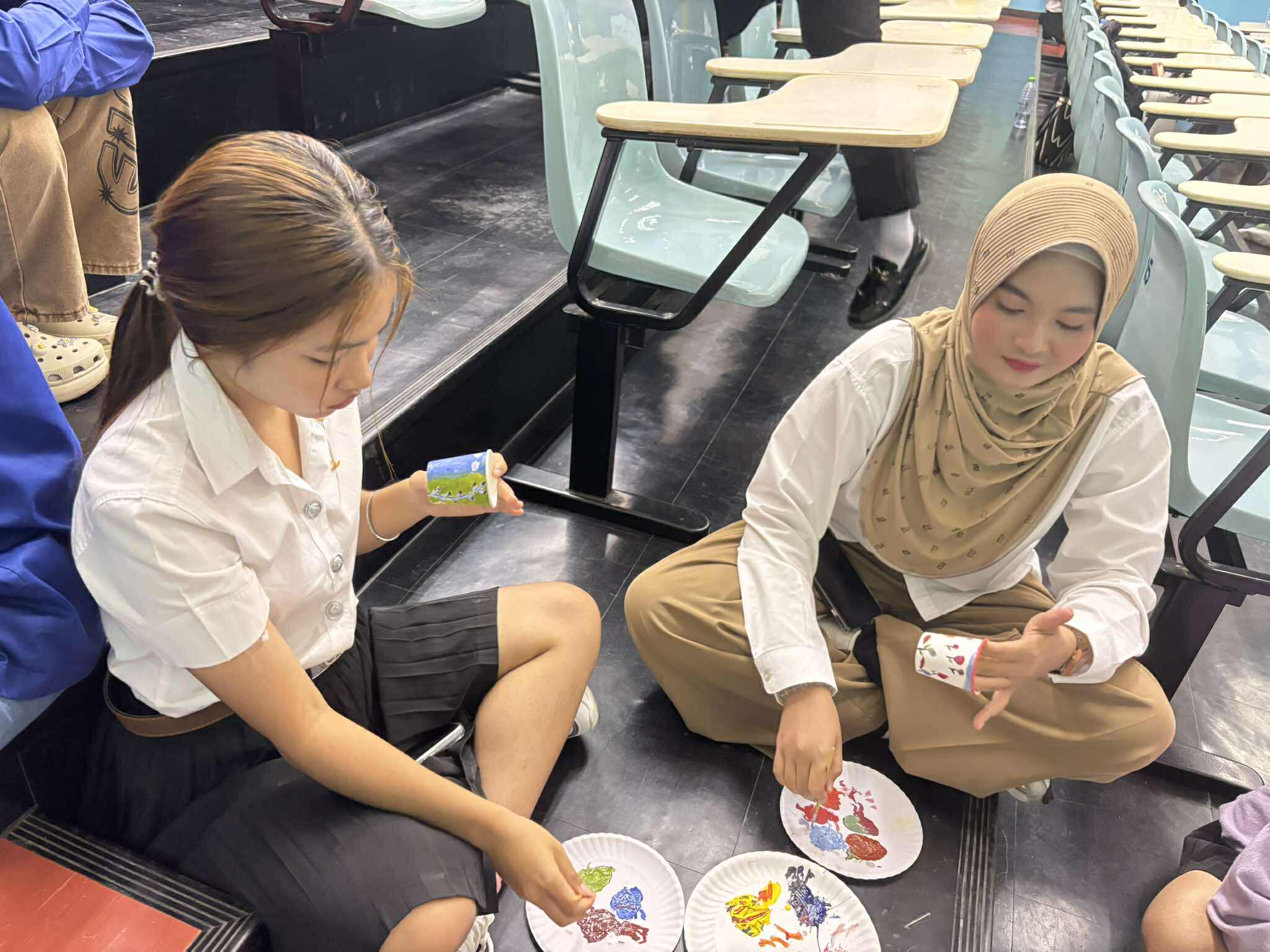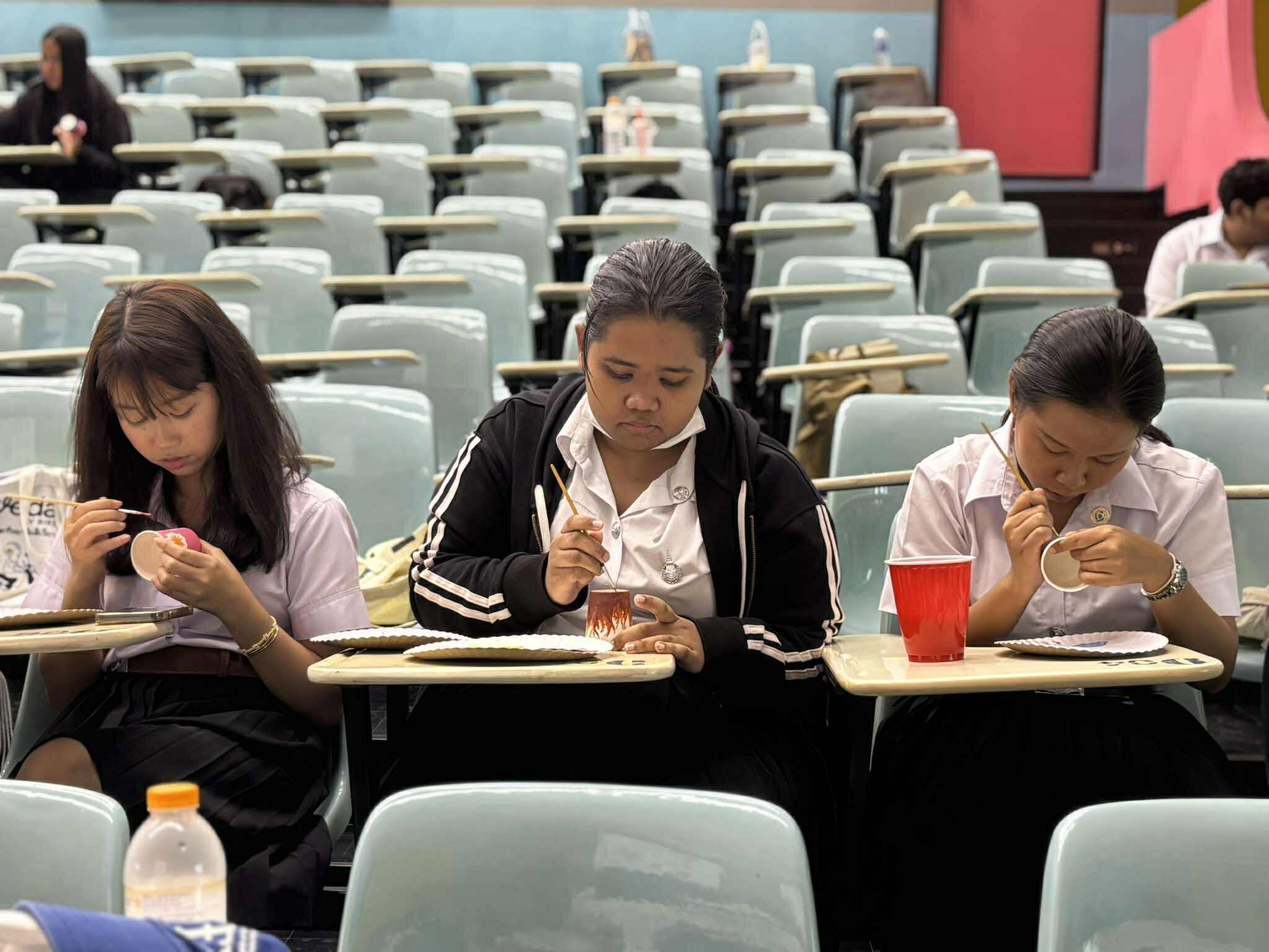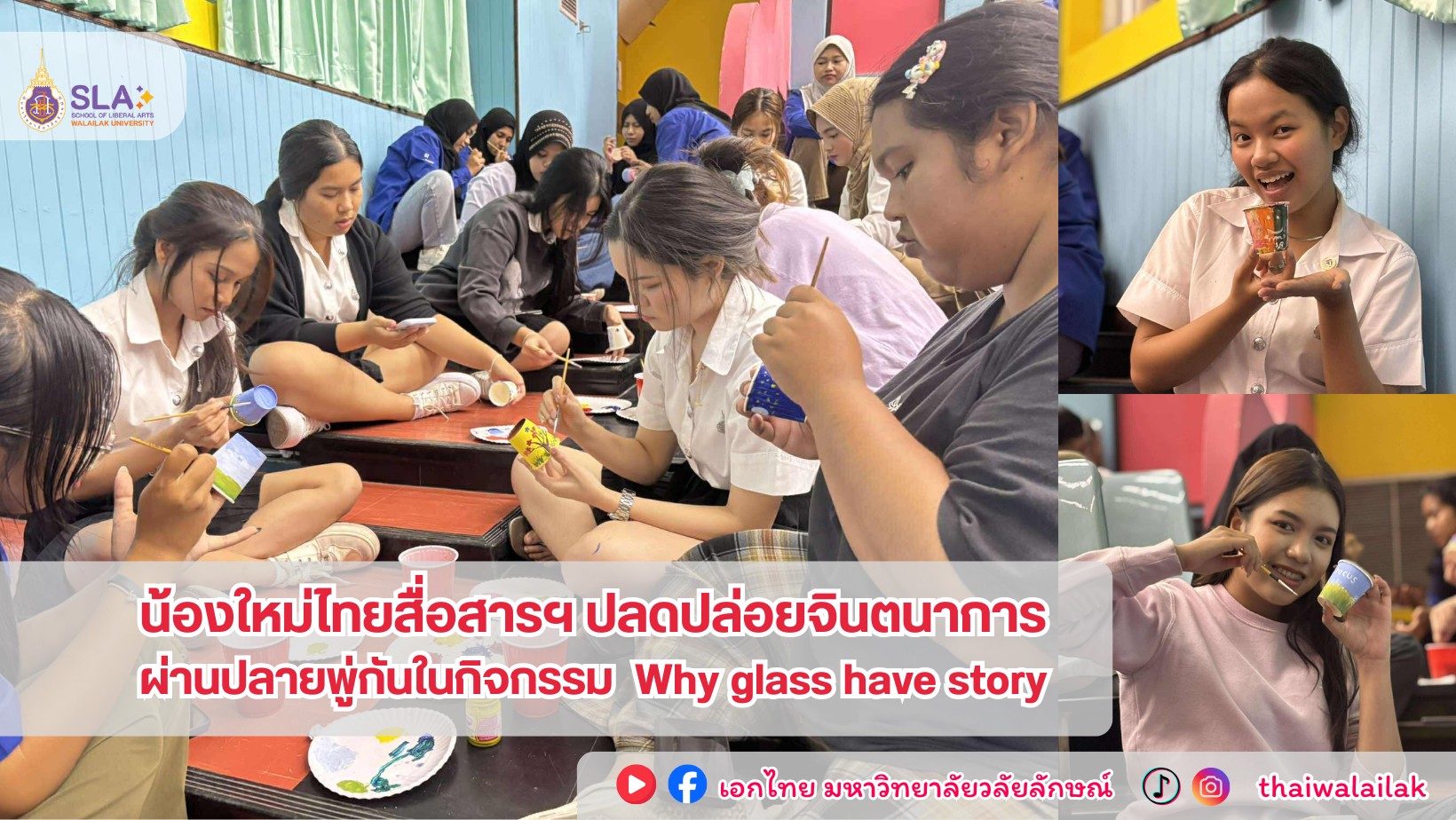 วันที่ 9 กรกฎาคม 2568 เวลา 13.00-16.00 น. ณ ห้อง 1209 อาคารวิชาการ 1 มหาวิทยาลัยวลัยลักษณ์ นักศึกษาชั้นปีที่ 1 หลักสูตรศิลปศาสตรบัณฑิต สาขาภาษาไทยเพื่อการสื่อสาร ได้เข้าร่วมกิจกรรม “Why glass have story” ซึ่งเป็นกิจกรรมที่เปิดโอกาสให้นักศึกษาได้แสดงออกถึงความคิดสร้างสรรค์ในการแต้มสีและวาดลวดลายบอกเล่าเรื่องราวบนแก้วกระดาษ กิจกรรมศิลปะนี้ไม่เพียงช่วยเสริมสร้างจิตใจที่อ่อนโยน แต่ยังเปิดพื้นที่ให้นักศึกษาได้ฝึกใช้ความคิดอย่างอิสระ นอกจากนี้ ผู้เข้าร่วมกิจกรรมจะได้รับคะแนนความดีหมวดพัฒนาภาวะผู้นำ 1.5 คะแนน และหมวดใจอาสา 1.5 คะแนน สาขาวิชาภาษาไทยขอขอบคุณสโมสรนักศึกษาสำนักวิชาศิลปศาสตร์ที่ได้จัดกิจกรรมดีๆ มา ณ โอกาสนี้