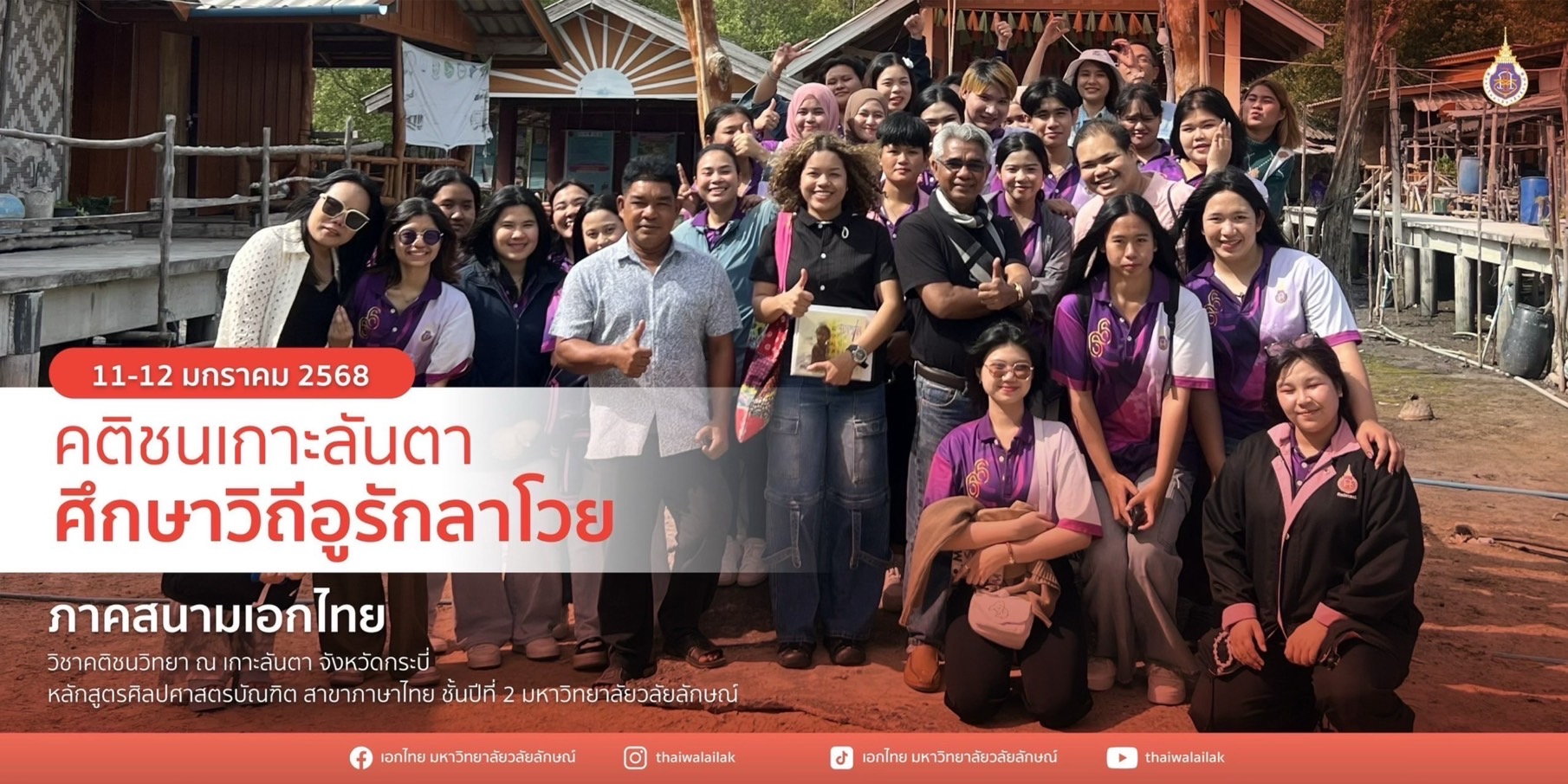 เมื่อวันที่ 11-12 มกราคม 2568 หลักสูตรศิลปศาสตรบัณฑิต สาขาภาษาไทย สำนักวิชาครุศาสตร์และศิลปศาสตร์ มหาวิทยาลัยวลัยลักษณ์ นำโดยผู้ช่วยศาสตราจารย์ทัดดาว รักมาก หัวหน้าสาขาวิชาภาษาไทย และอาจารย์อนุชสรา เรืองมาก อาจารย์ผู้รับผิดชอบรายวิชา THA62-203 คติชนวิทยา พร้อมด้วยอาจารย์-นักวิชาการ 4 ท่าน และนักศึกษาสาขาภาษาไทย ชั้นปีที่ 2 จำนวน 25 คน ร่วมกิจกรรมเรียนรู้ภาคสนาม ณ เกาะลันตา จังหวัดกระบี่ โดยมีกิจกรรมที่น่าสนใจหลากหลายตลอดทั้งสองวัน