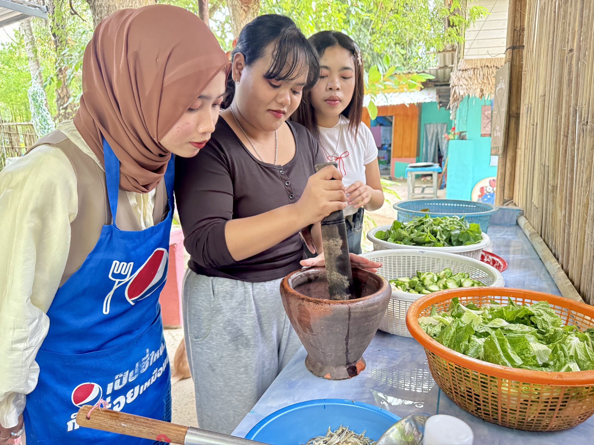 - ฐานที่ 2 อาหารพื้นบ้าน วิทยากรคือ คุณสมร นาวาเดช นักศึกษาได้รู้จักการปรุงอาหารจากวัตถุดิบในท้องถิ่น เช่น ปลาทูแขก และผักลำเพ็ง