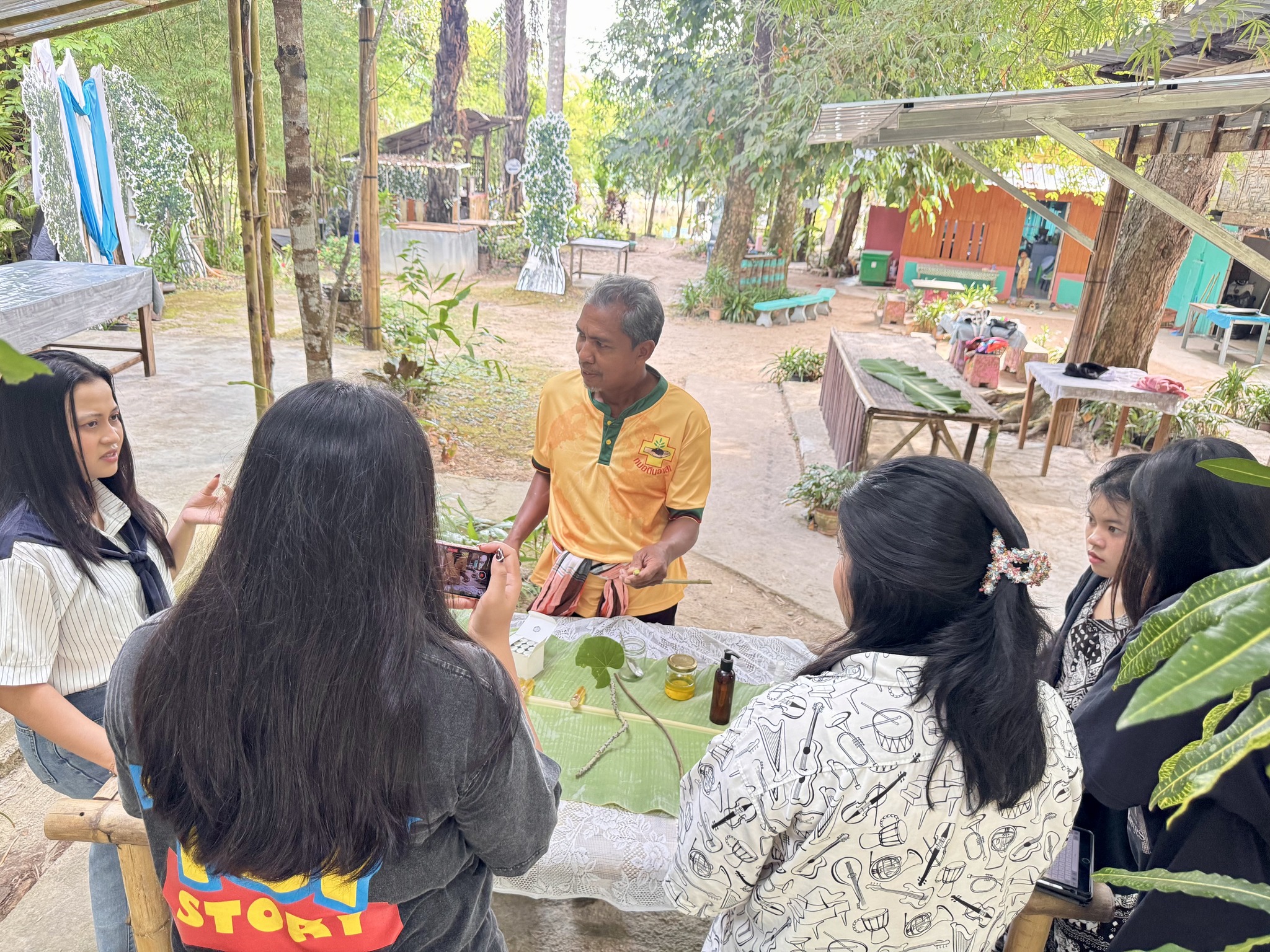 - ฐานที่ 1 สมุนไพรท้องถิ่น วิทยากรคือ คุณร่อเกม อดทน นักศึกษาได้เรียนรู้เกี่ยวกับชนิดของสมุนไพรในท้องถิ่น ลักษณะ กลิ่น สี รสชาติ และสรรพคุณ