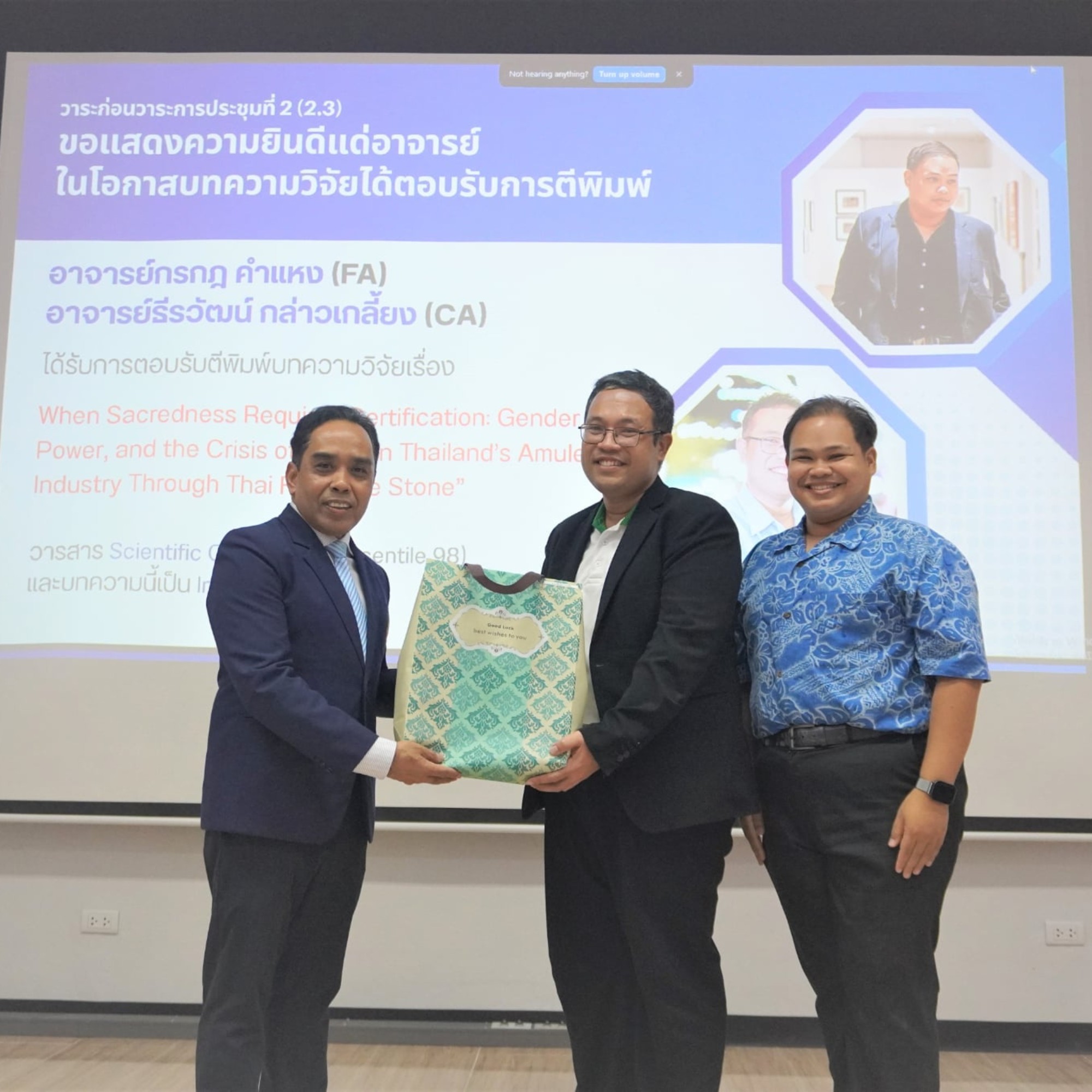 - อาจารย์ธีรวัฒน์ กล่าวเกลี้ยง และ อาจารย์กรกฎ คำแหง ผู้เขียนบทความวิจัยเรื่อง When Sacredness Requires Certification: Gender, Power, and the Crisis of Faith on Thailand’s Amulet Industry Through Thai Film “The Stone” บทความนี้เป็น inter collaboration เขียนร่วมกับ Dr. Luo Xiu จาก Xihua University สาธารณรัฐประชาชนจีน