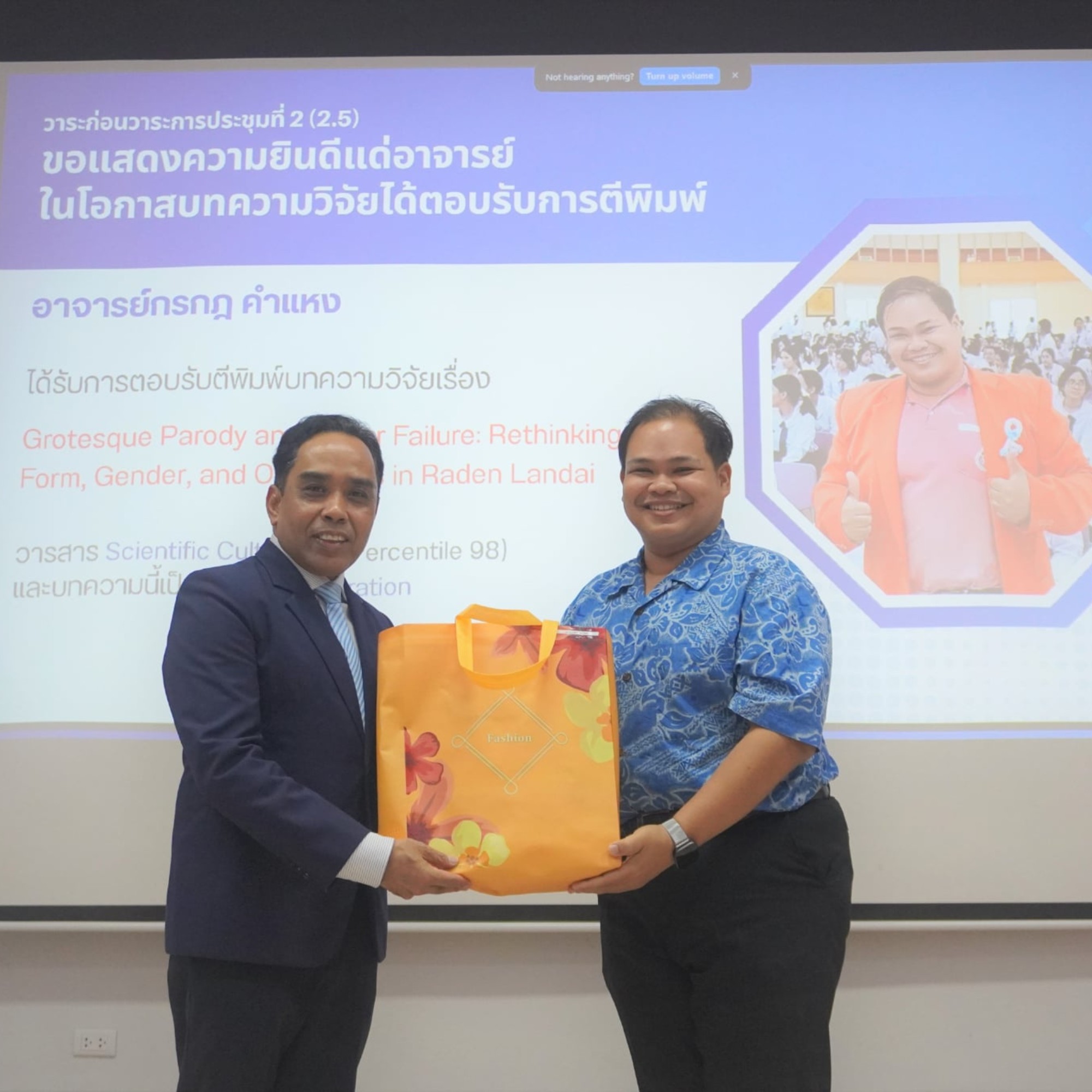 - อาจารย์กรกฎ คำแหง ผู้เขียนบทความวิจัยเรื่อง Grotesque Parody and Queer Failure: Rethinking Form, Gender, and Otherness in Raden Landai บทความนี้เป็น inter collaboration เขียนร่วมกับ Dr.Guo Tingting จาก Yunnan University สาธารณรัฐประชาชนจีน