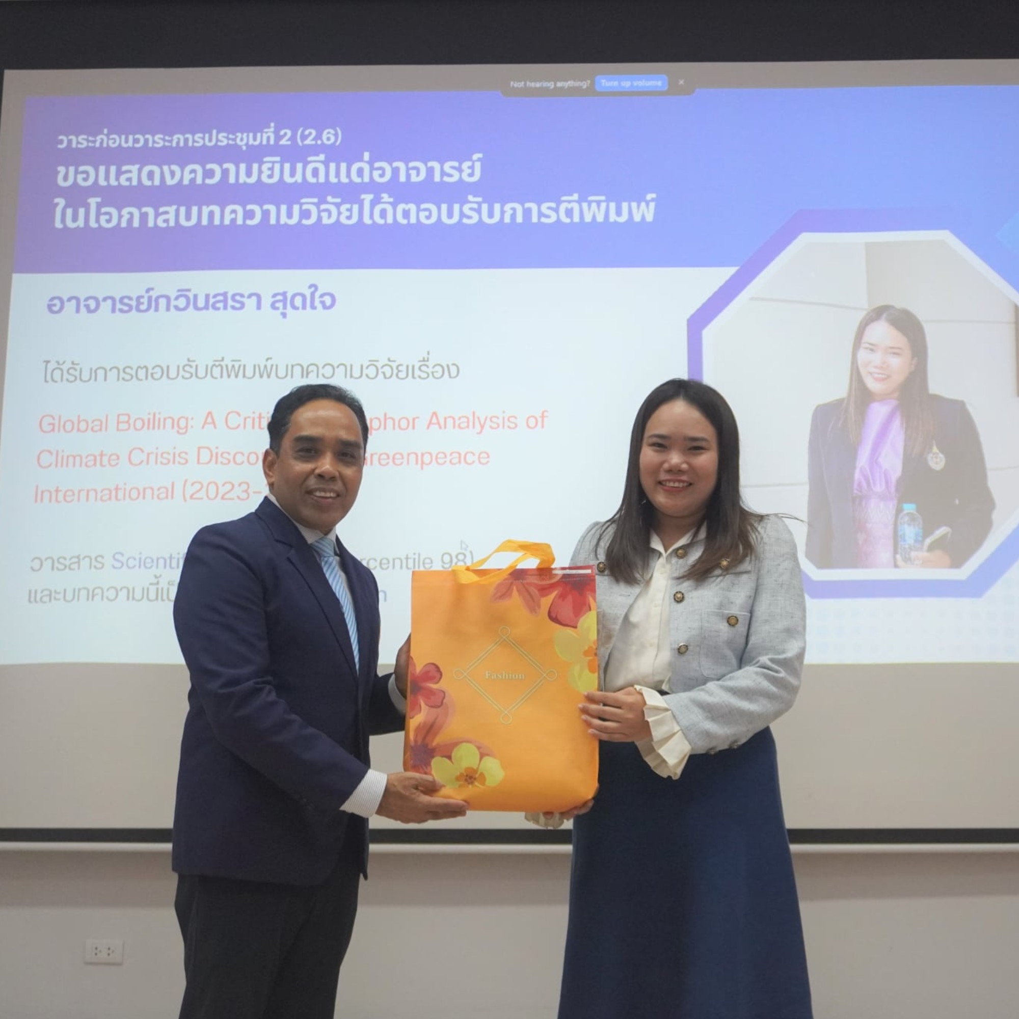 - อาจารย์กวินสรา สุดใจ ผู้เขียนบทความวิจัยเรื่อง “Global Boiling: A Critical Metaphor Analysis of Climate Crisis Discourse on Greenpeace International (2023–2024)” ได้ตอบรับตีพิมพ์ในวารสาร Scientific Culture (Scopus Q1, percentile 98) บทความดังกล่าวเขียนร่วมกับอาจารย์ ดร.จุฑาคภัสติ์ รัตนพันธ์ (Corresponding Author) (สำนักวิชาศึกษาศาสตร์ สาขาวิชาการสอนภาษาไทย) และ อาจารย์กฤษฎา กันติชล (Co-Author) (สำนักวิชาพหุภาษาและการศึกษาทั่วไป)