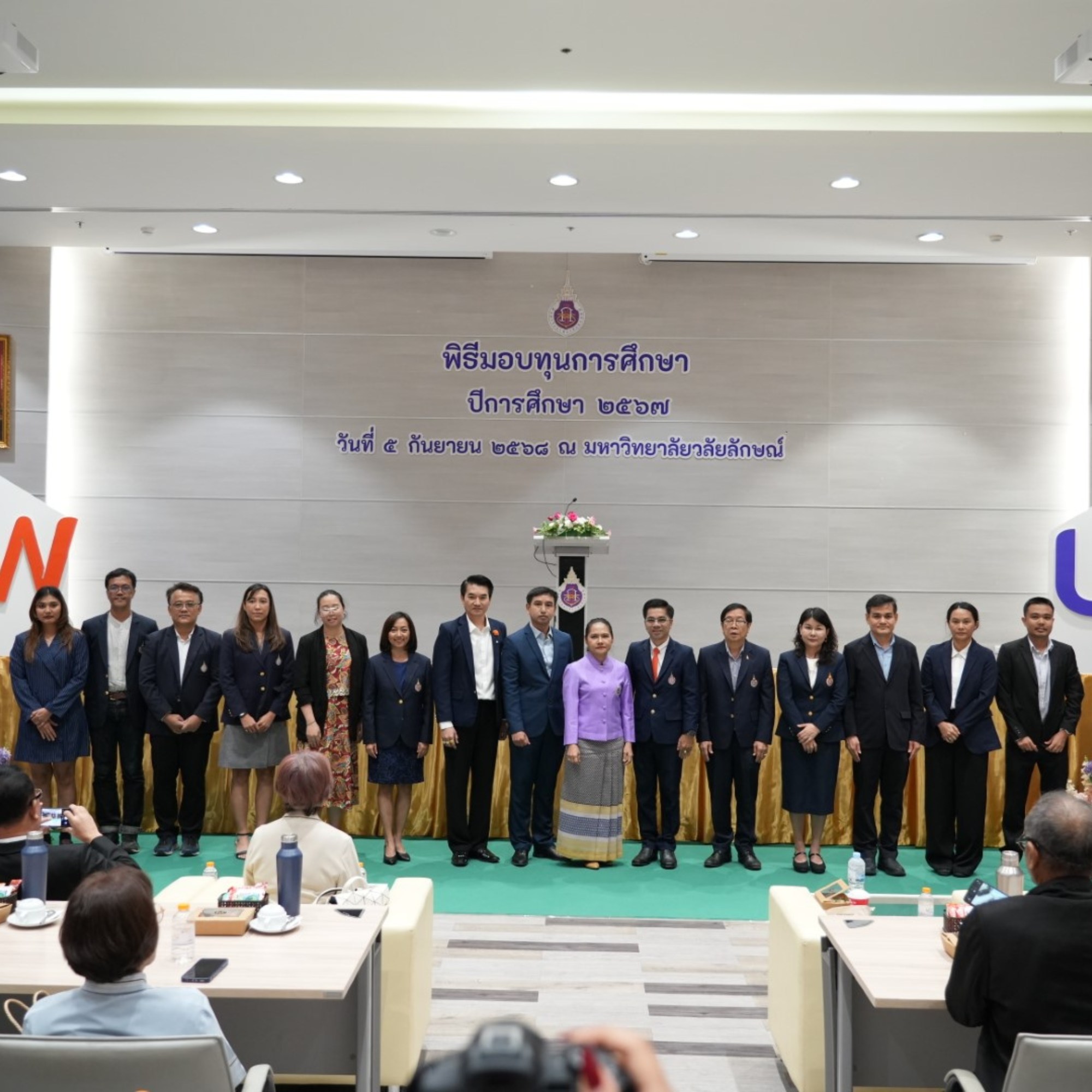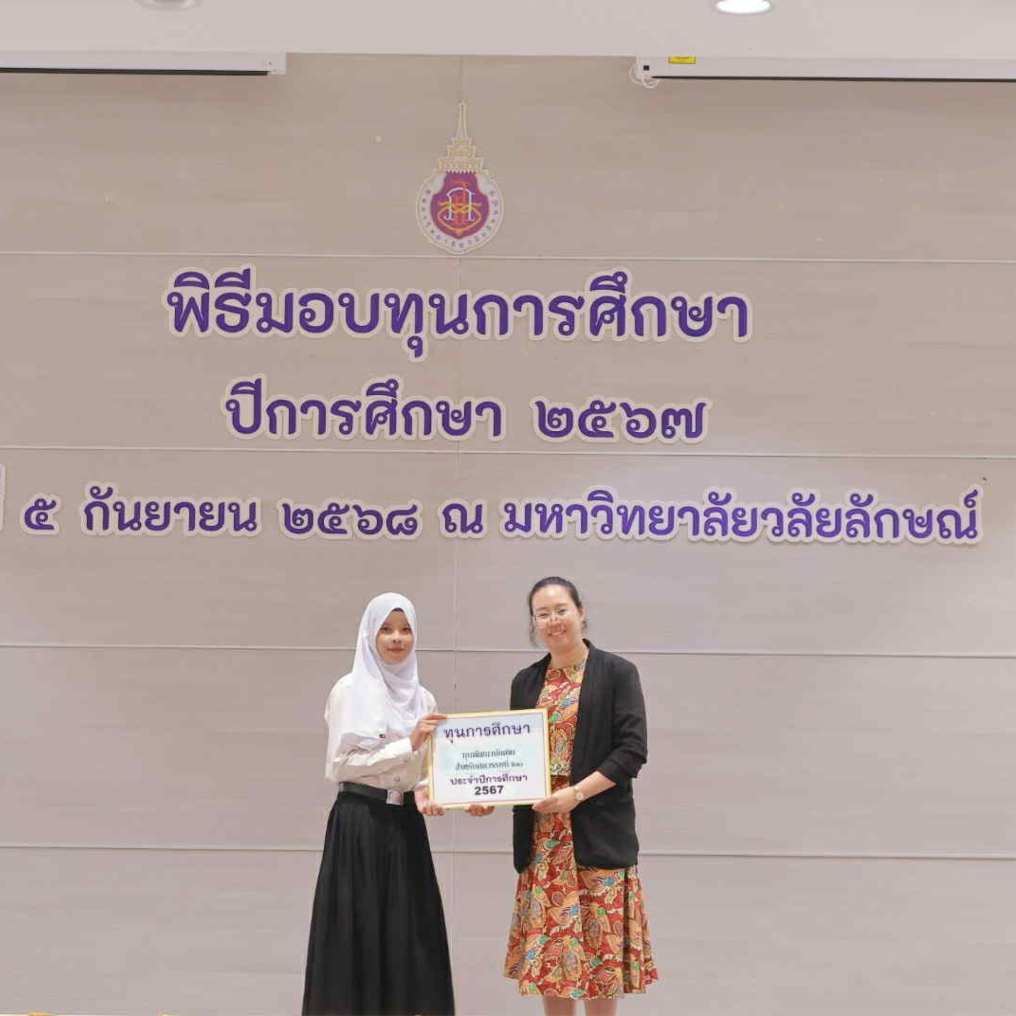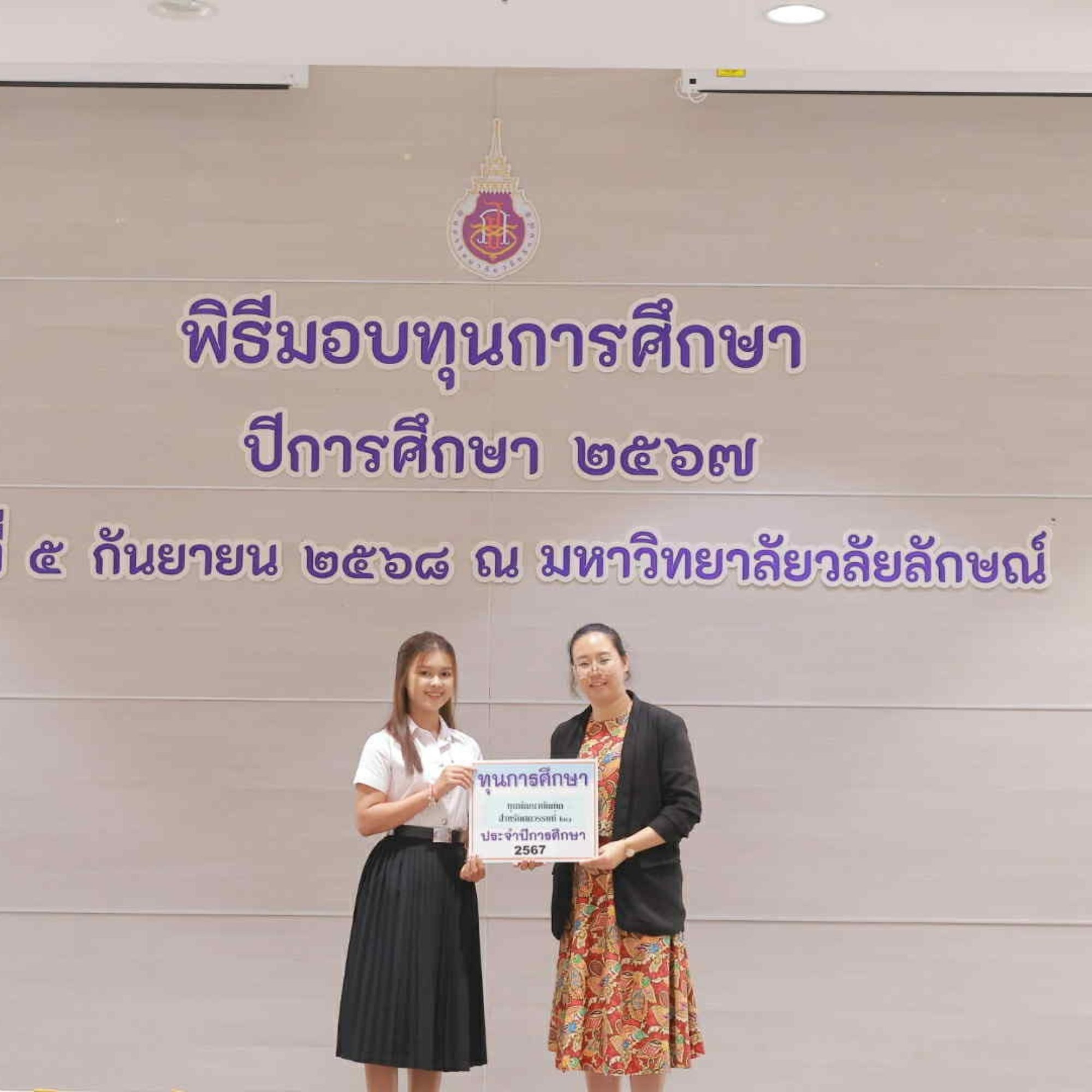เมื่อวันที่ 5 กันยายน 2568 นางสาวชลลดา นะตะพันธ์ และนางสาวธิดารัตน์ บุญรัตน์ นักศึกษาชั้นปีที่ 2 หลักสูตรศิลปศาสตรบัณฑิต สาขาภาษาไทยเพื่อการสื่อสาร สำนักวิชาศิลปศาสตร์ มหาวิทยาลัยวลัยลักษณ์ เข้าร่วมพิธีมอบทุนการศึกษา ประจำปีการศึกษา 2567 จัดโดยส่วนส่งเสริมและพัฒนานักศึกษา ณ โรงพยาบาลศูนย์การแพทย์ มหาวิทยาลัยวลัยลักษณ์ โดยทั้งสองคนได้รับทุนพัฒนาศักยภาพบัณฑิตแห่งศตวรรษที่ 21 ซึ่งเป็นทุนยกเว้นค่าธรรมเนียมการศึกษา