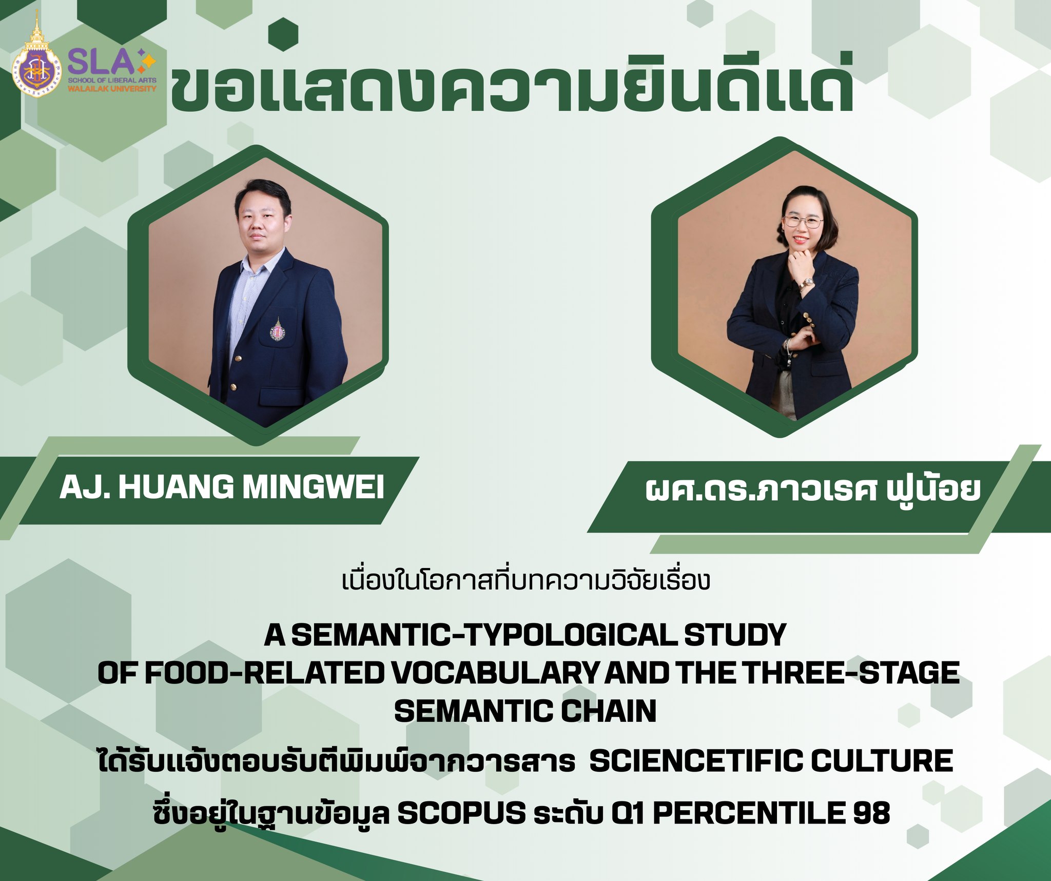 สาขาวิชาภาษาจีน สำนักวิชาศิลปศาสตร์ ขอแสดงความยินดีแด่ Aj. Huang Mingwei และ ผู้ช่วยศาสตราจารย์ ดร.ภาวเรศ ฟูน้อย อาจารย์ประจำสาขาวิชาภาษาจีน ในโอกาสที่บทความวิจัยเรื่องA Semantic-Typological Study of Food-Related Vocabulary and the Three-Stage Semantic Chain ได้รับการตอบรับตีพิมพ์ในวารสาร Sciencetific Culture (Scopus Q1 Percentile 98) คิดชื่อเรื่อง