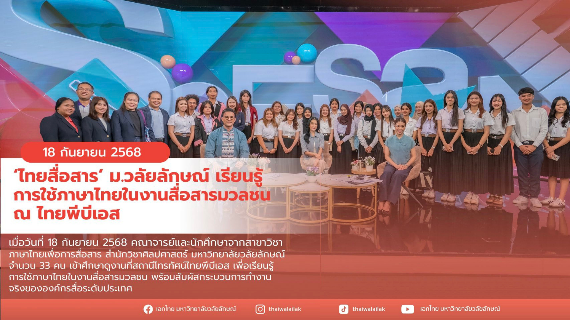 เมื่อวันที่ 18 กันยายน 2568 คณาจารย์และนักศึกษา สาขาวิชาภาษาไทยเพื่อการสื่อสาร สำนักวิชาศิลปศาสตร์ มหาวิทยาลัยวลัยลักษณ์ จำนวน 33 คน เข้าศึกษาดูงานที่สถานีโทรทัศน์ไทยพีบีเอส เพื่อเรียนรู้การใช้ภาษาไทยในงานสื่อสารมวลชน พร้อมสัมผัสกระบวนการทำงานจริงขององค์กรสื่อระดับประเทศ