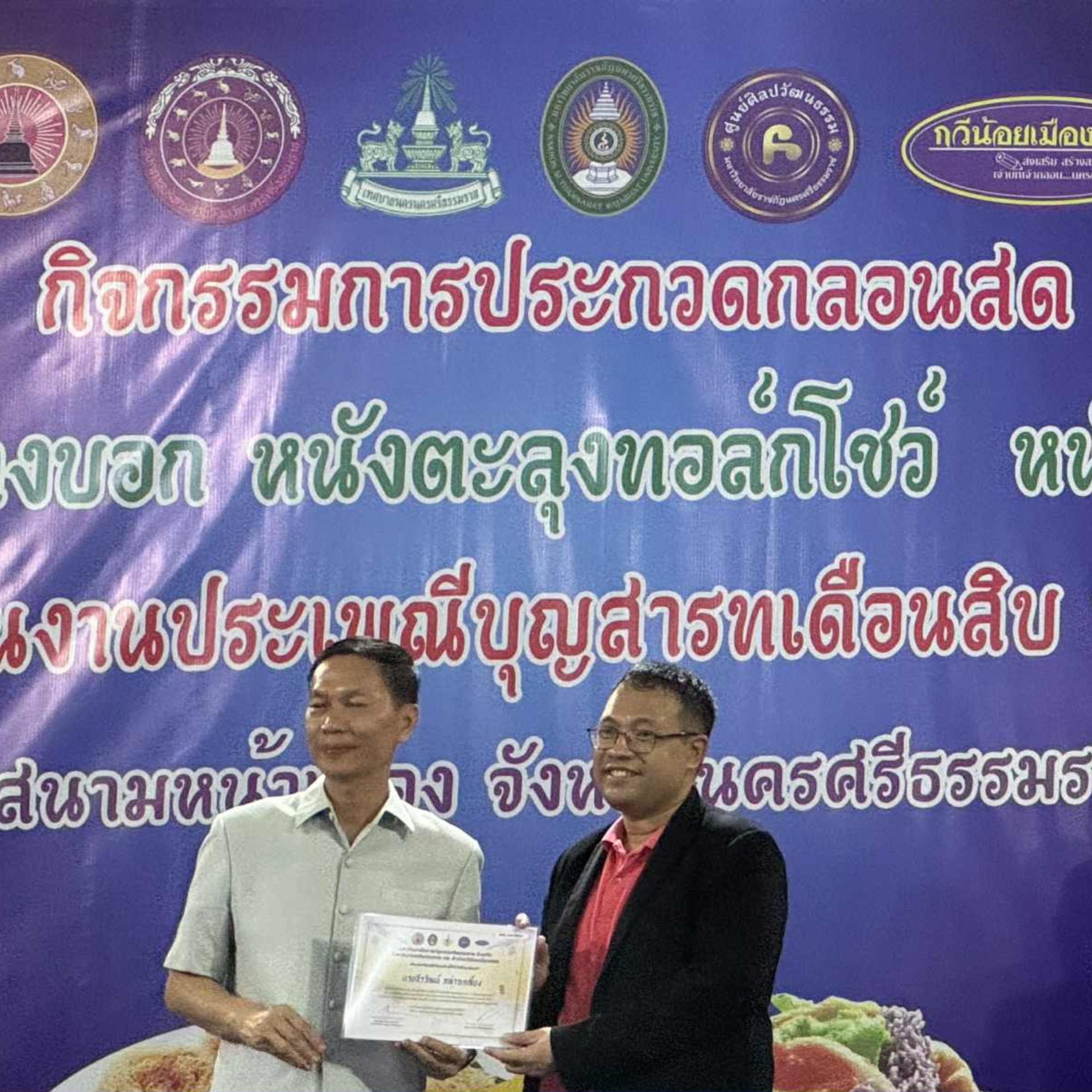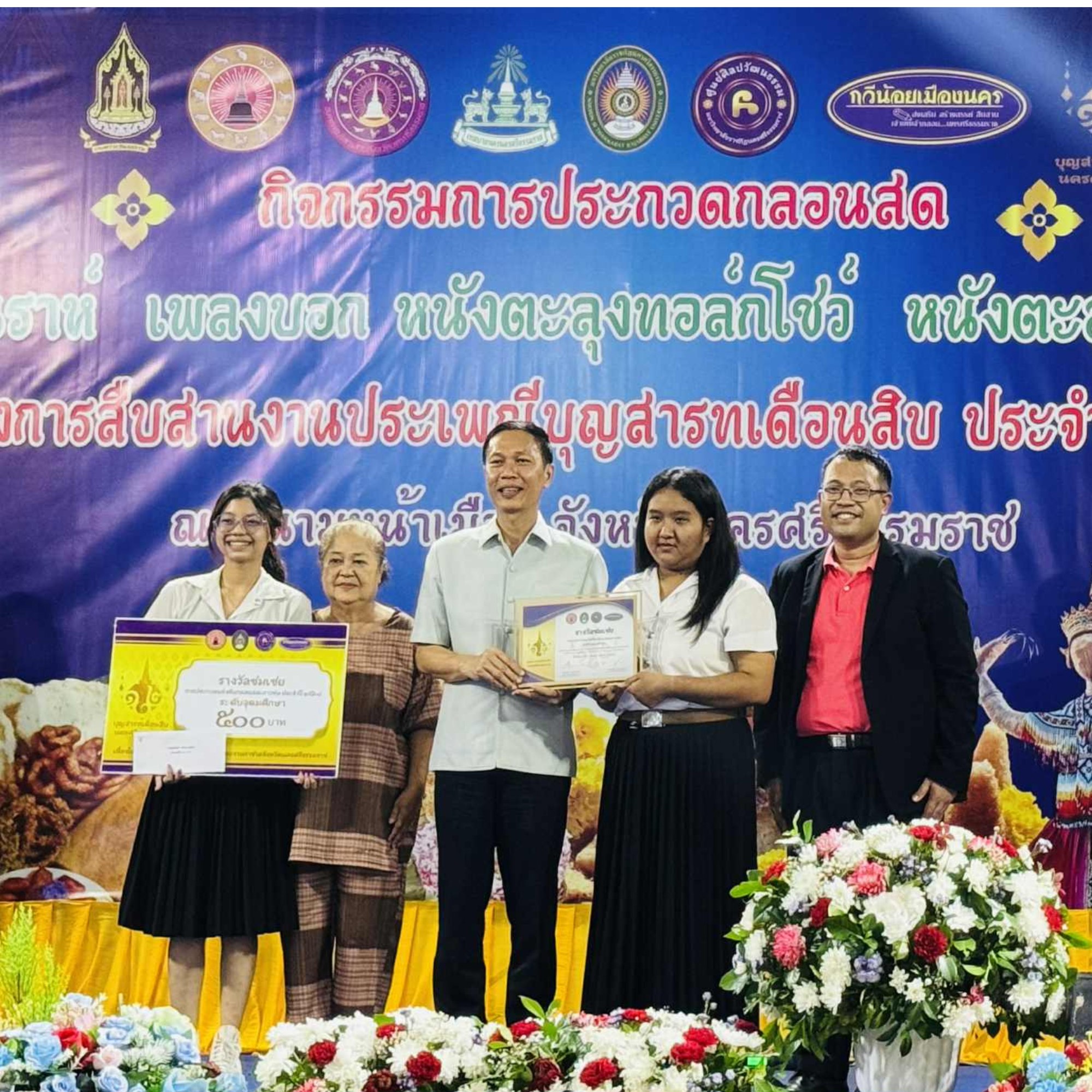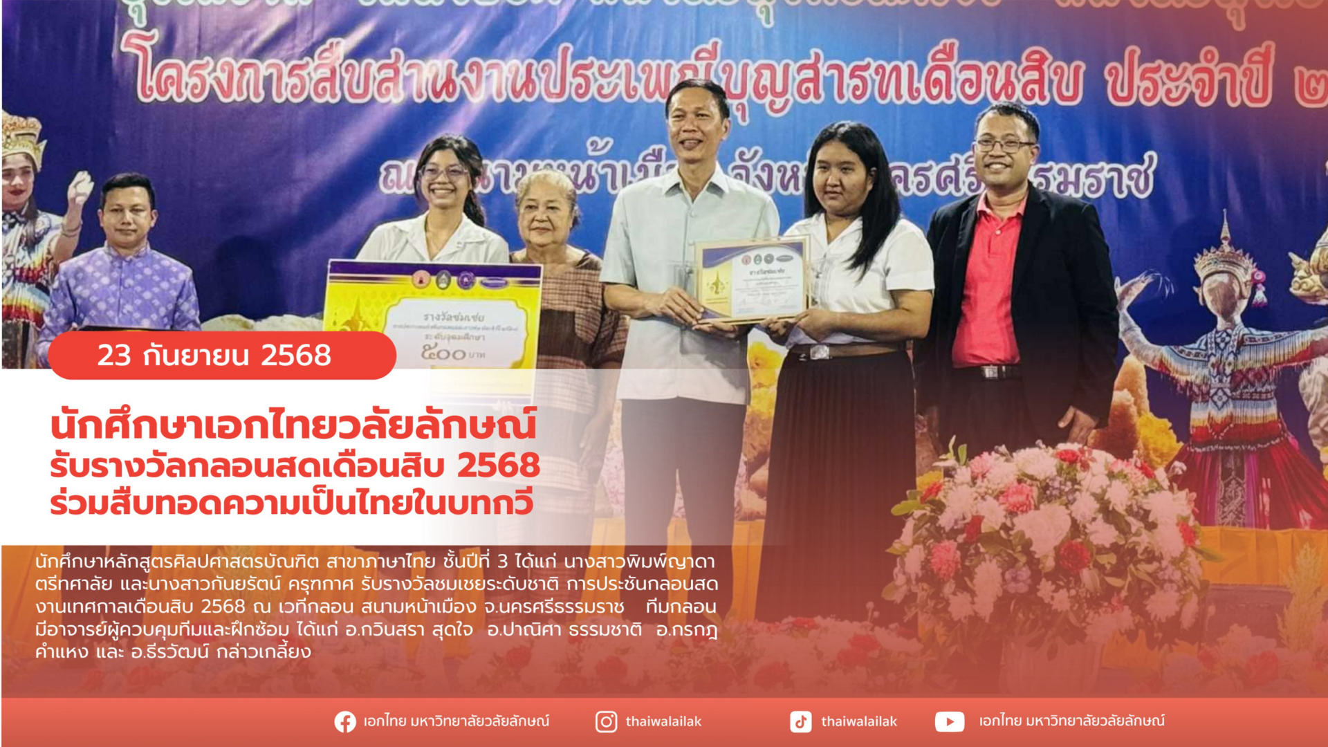 นักศึกษาหลักสูตรศิลปศาสตรบัณฑิต สาขาภาษาไทย ชั้นปีที่ 3 ได้แก่ นางสาวพิมพ์ญาดา ตรีทศาลัย และนางสาวกันยรัตน์ ครุฑกาศ รับรางวัลชมเชยระดับชาติ การประชันกลอนสดงานเทศกาลเดือนสิบ 2568 ณ เวทีกลอน สนามหน้าเมือง จ.นครศรีธรรมราช ทั้งนี้ทีมกลอนมีอาจารย์ผู้ควบคุมทีมและฝึกซ้อม ได้แก่ อ.กวินสรา สุดใจ อ.ปาณิศา ธรรมชาติ อ.กรกฎ คำแหง และ อ.ธีรวัฒน์ กล่าวเกลี้ยง