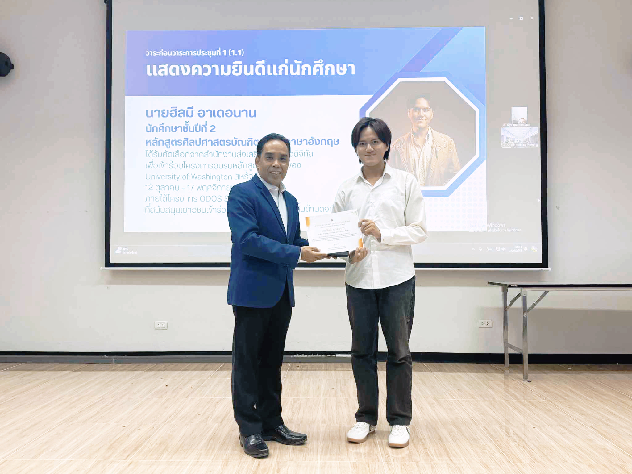 1. นายฮิลมี อาเดอนาน นักศึกษาชั้นปีที่ 2 หลักสูตรศิลปศาสตรบัณฑิต สาขาภาษาอังกฤษ ได้รับคัดเลือกจากสำนักงานส่งเสริมเศรษฐกิจดิจิทัล เพื่อเข้าร่วมโครงการอบรมหลักสูตรระยะสั้นของ University of Washington สหรัฐอเมริกา ช่วงเวลาอบรม: 12 ตุลาคม – 17 พฤศจิกายน 2568 (ซึ่งอยู่ภายใต้โครงการ ODOS Summer Camp ที่สนับสนุนเยาวชนเข้าร่วมหลักสูตรอบรมระยะสั้นด้านดิจิทัล)