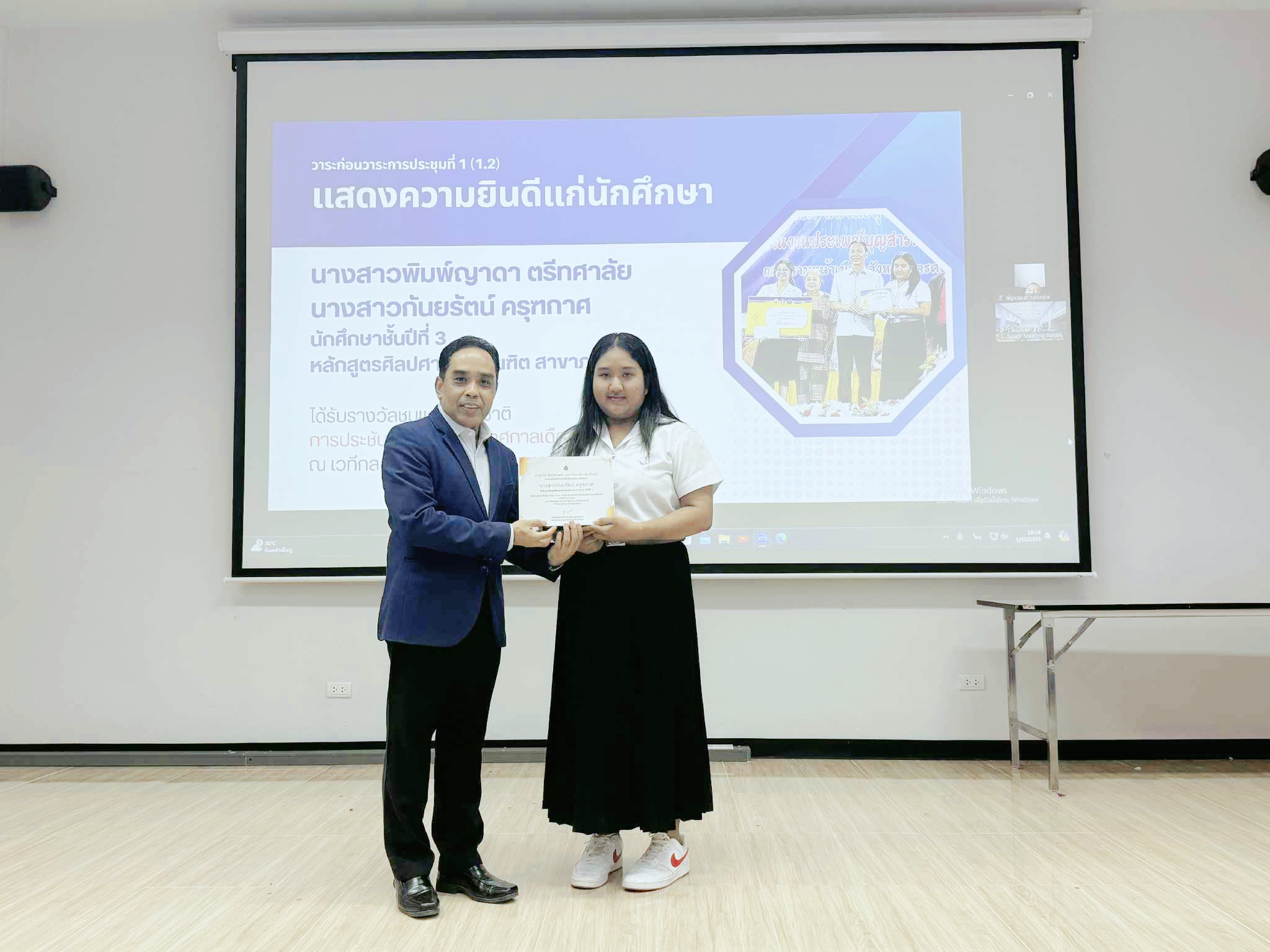 2. นางสาวพิมพ์ญาดา ตรีทศาลัย และนางสาวกันยรัตน์ ครุฑกาศ นักศึกษาชั้นปีที่ 3 หลักสูตรศิลปศาสตรบัณฑิต สาขาภาษาไทย ได้รับรางวัลชมเชยระดับชาติ การประชันกลอนสดงานเทศกาลเดือนสิบ 2568 ณ เวทีกลอน สนามหน้าเมือง จ.นครศรีธรรมราช