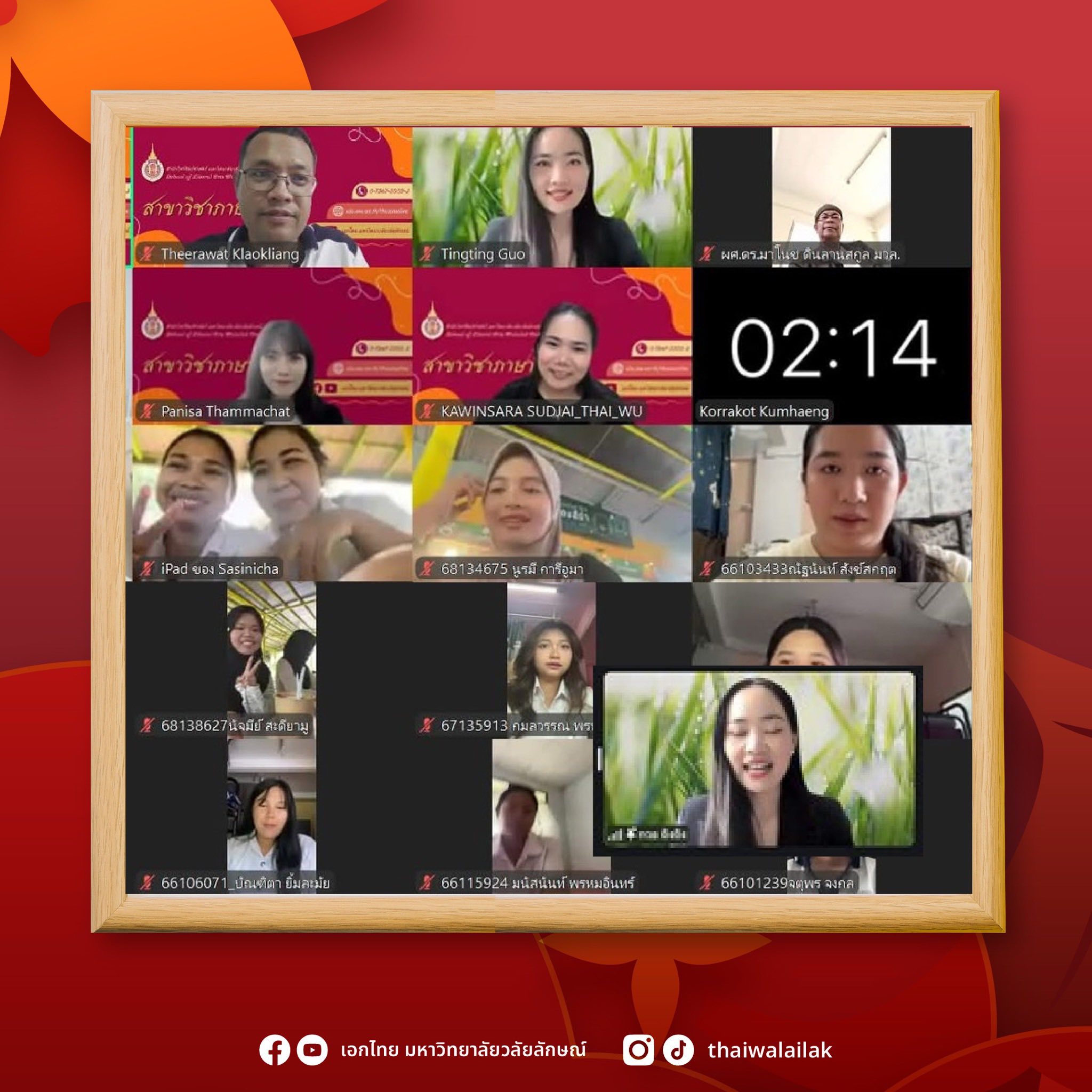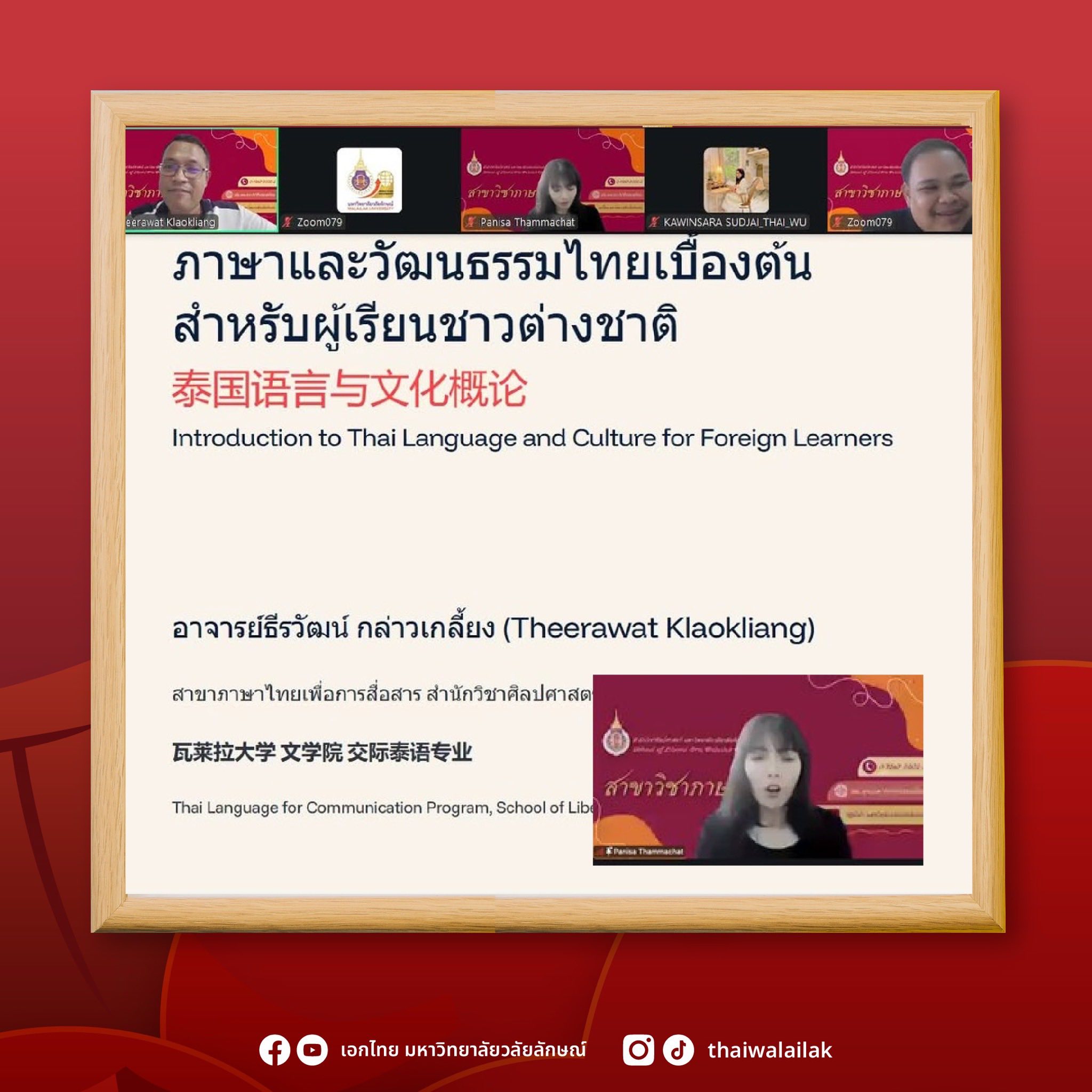 บรรยากาศ สัมมนาวิชาการออนไลน์ เรื่อง “การสอนภาษาไทยในฐานะภาษาต่างประเทศสำหรับผู้เรียนชาวจีน เพื่อฉลองครบรอบ 50 ปี ความสัมพันธ์ทางการทูตไทย–จีน” เมื่อวันพุธที่ 12 พฤศจิกายน พ.ศ. 2568 ผ่านทางโปรแกรม zoom จัดโดยสาขาวิชาภาษาไทยเพื่อการสื่อสาร สำนักวิชาศิลปศาสตร์ มหาวิทยาลัยวลัยลักษณ์ ร่วมกับ สาขาวิชาภาษาไทย ภาควิชาภาษาและวัฒนธรรมเอเชียตะวันออกเฉียงใต้สำนักวิชาภาษาต่างประเทศ มหาวิทยาลัยยูนนาน สาธารณรัฐประชาชนจีน