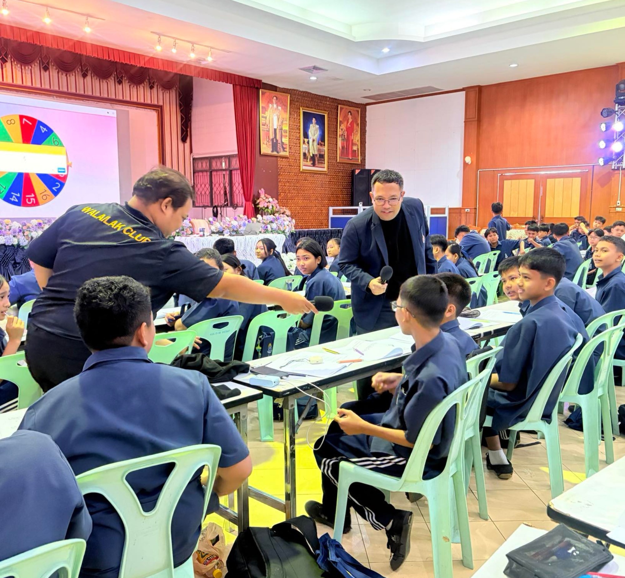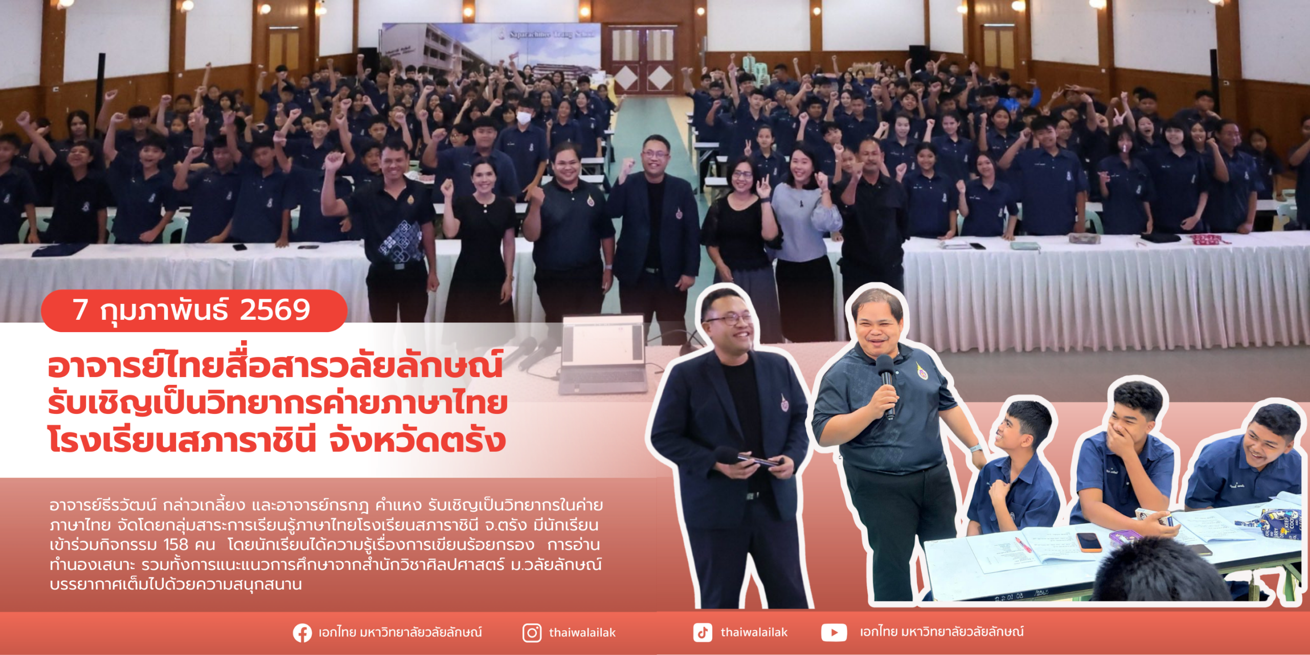 เมื่อวันที่ 7 กุมภาพันธ์ 2569 อาจารย์ธีรวัฒน์ กล่าวเกลี้ยง และอาจารย์กรกฎ คำแหง อาจารย์ประจำสาขาภาษาไทยเพื่อการสื่อสาร สำนักวิชาศิลปศาสตร์ มหาวิทยาลัยวลัยลักษณ์ รับเชิญเป็นวิทยากรในค่ายภาษาไทย จัดโดยกลุ่มสาระการเรียนรู้ภาษาไทย โรงเรียนสภาราชินี จ.ตรัง มีนักเรียนเข้าร่วมกิจกรรม 158 คน โดยนักเรียนได้ความรู้เรื่องการเขียนร้อยกรอง การอ่านทำนองเสนาะ รวมทั้งการแนะแนวการศึกษาจากสำนักวิชาศิลปศาสตร์ ม.วลัยลักษณ์ บรรยากาศเต็มไปด้วยความสนุกสนาน