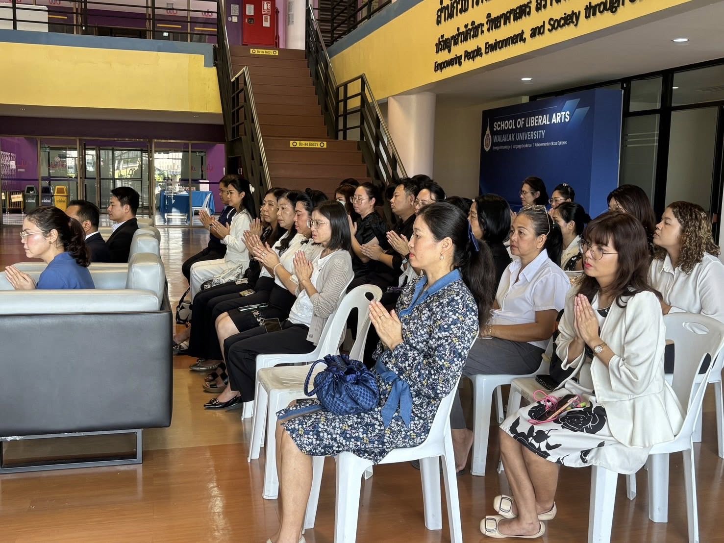 ในโอกาสนี้ ได้รับเกียรติจาก รองศาสตราจารย์ ดร.จรัญ บุญกาญจน์ รองอธิการบดีฝ่ายวิชาการด้านมนุษยศาสตร์และสังคมศาสตร์ เป็นประธานในพิธี พร้อมด้วย รองศาสตราจารย์ ดร.ศราวุธ ปาลิโภชน์ รองอธิการบดีฝ่ายวิชาการด้านวิทยาศาสตร์สุขภาพ และอาจารย์ ดร.กมลทิพย์ คล้ายบ้านใหม่ รักษาการแทนคณบดีสำนักวิชาศิลปศาสตร์ รองคณบดี ผู้บริหาร คณาจารย์ และบุคลากรสำนักวิชาศิลปศาสตร์ เข้าร่วมพิธีโดยพร้อมเพรียงกัน