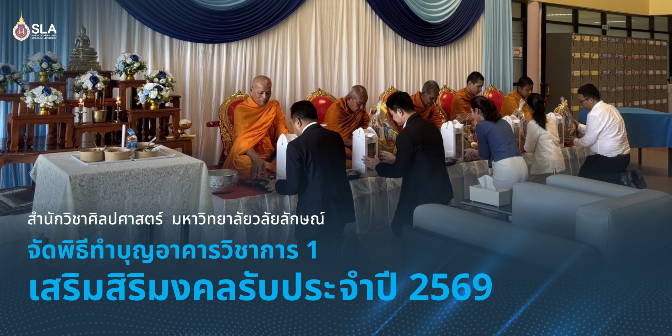 เมื่อวันพฤหัสบดีที่ 26 กุมภาพันธ์ 2569 เวลา 10.00–12.00 น. สำนักวิชาศิลปศาสตร์ มหาวิทยาลัยวลัยลักษณ์ จัดพิธีทำบุญอาคารวิชาการ 1 ณ บริเวณโถงกลาง ชั้น 1 อาคารวิชาการ 1 เพื่อความเป็นสิริมงคลแก่ผู้บริหาร คณาจารย์ บุคลากร และนักศึกษา