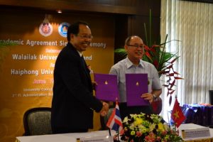อนึ่ง ก่อนหน้านี้คณะผู้บริหารมหาวิทยาลัยวลัยลักษณ์และคณาจารย์จากหลักสูตรอาเซียนศึกษา ได้เดินทางไปเยือนและลงนามในข้อตกลงความเข้าใจ (MOU) ว่าด้วยความร่วมมือทางวิชาการ  ณ Haiphong University เมื่อเดือนพฤศจิกายน 2556 การมาเยือนของคณะผู้บริหารจาก Haiphong University ในครั้งนี้จึงถือเป็นการกระชับความสัมพันธ์ระหว่างทั้งสองมหาวิทยาลัยให้แน่นแฟ้นยิ่งขึ้น