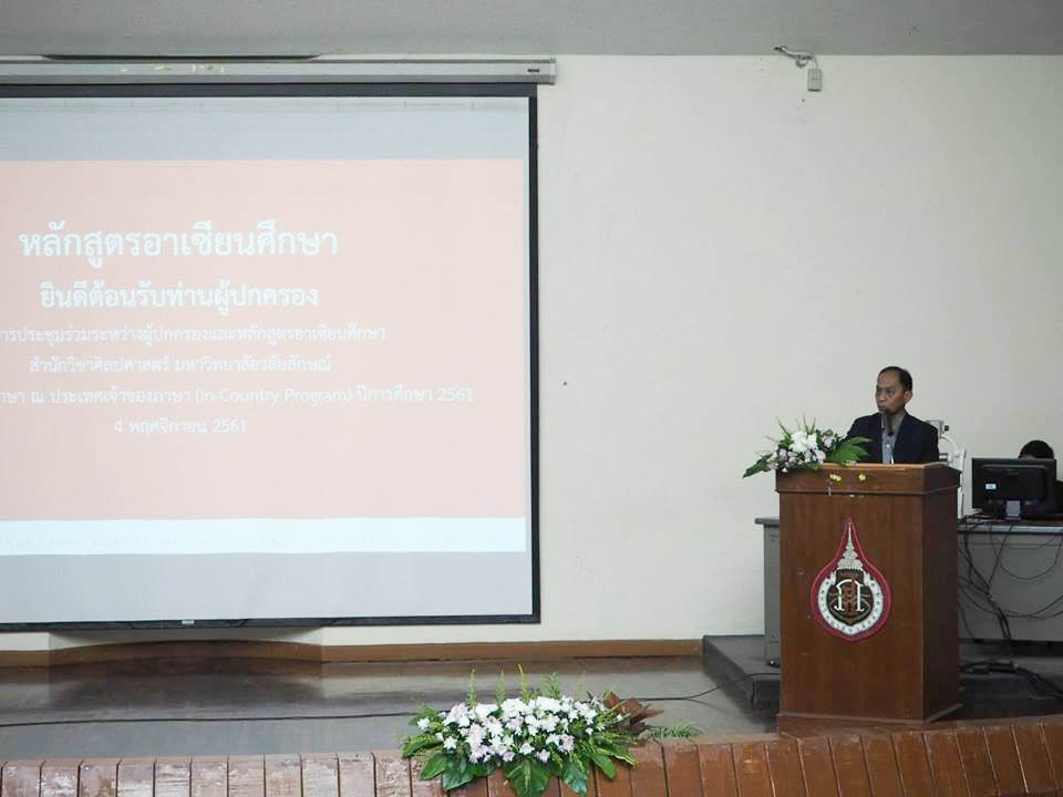 หลักสูตรฯเชื่อมั่นว่าการติดต่อประสานงานกันอย่างใกล้ชิดระหว่างผู้ปกครองและหลักสูตรฯ จะเป็นส่วนสำคัญที่สนับสนุนให้การจัดการการศึกษาและการดูแลนักศึกษาขณะศึกษาอยู่ต่างประเทศดำเนินไปอย่างราบรื่นและมีประสิทธิภาพจึงจัดกิจกรรมการประชุมร่วมระหว่างผู้ปกครองและหลักสูตรอาเซียนศึกษา สำนักวิชาศิลปศาสตร์ มหาวิทยาลัยวลัยลักษณ์ เรื่อง การศึกษาภาษา ณ ประเทศเจ้าของภาษา (In-Country Program) ประจำปีการศึกษา 2561 เพื่อชี้แจงรายละเอียดเกี่ยวกับกระบวนการไปศึกษาต่อของนักศึกษา ข้อกำหนดของหลักสูตรฯ และเรื่องอื่นๆ ที่เกี่ยวข้อง ในวันอาทิตย์ที่ 4 พฤศจิกายน 2561 เวลา 09.00 – 12.00 น. ณ ห้อง 5310 อาคารเรียนรวม 5