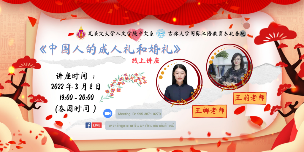 สาขาวิชาภาษาจีน สำนักวิชาศิลปศาสตร์ ร่วมกับมหาวิทยาลัยจี๋หลิน (Jilin University) สาธารณรัฐประชาชนจีน ขอเชิญชวนผู้สนใจฟังบรรยายพิเศษหัวข้อ “วัฒนธรรมการแต่งงาน และการจริญเติบโตเป็นผู้ใหญ่” โดยวิทยากรเจ้าของภาษา Ms.Wang Li(王莉)และ Ms.Wang Na(王娜)อาจารย์จากมหาวิทยาลัยจี๋หลิน (吉林大学)ในวันอังคารที่ 8 มีนาคม พ.ศ. 2565 เวลา 19.00 – 20.00 น.