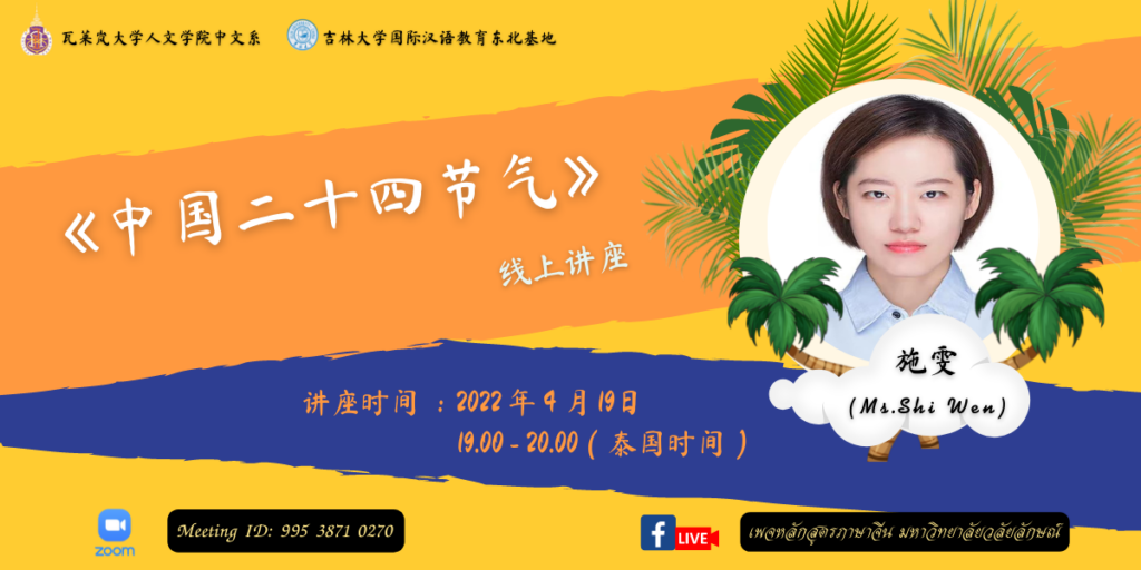 สาขาวิชาภาษาจีน สำนักวิชาศิลปศาสตร์ ร่วมกับมหาวิทยาลัยจี๋หลิน (Jilin University) สาธารณรัฐประชาชนจีน ขอเชิญชวนผู้สนใจฟังบรรยายพิเศษหัวข้อ “ฤดูกาลของจีน” โดยวิทยากรเจ้าของภาษา Ms.Shi Wen(施雯)อาจารย์จากมหาวิทยาลัยจี๋หลิน(吉林大学)ในวันอังคารที่ 19 เมษายน พ.ศ. 2565 เวลา 19.00 – 20.00 น.