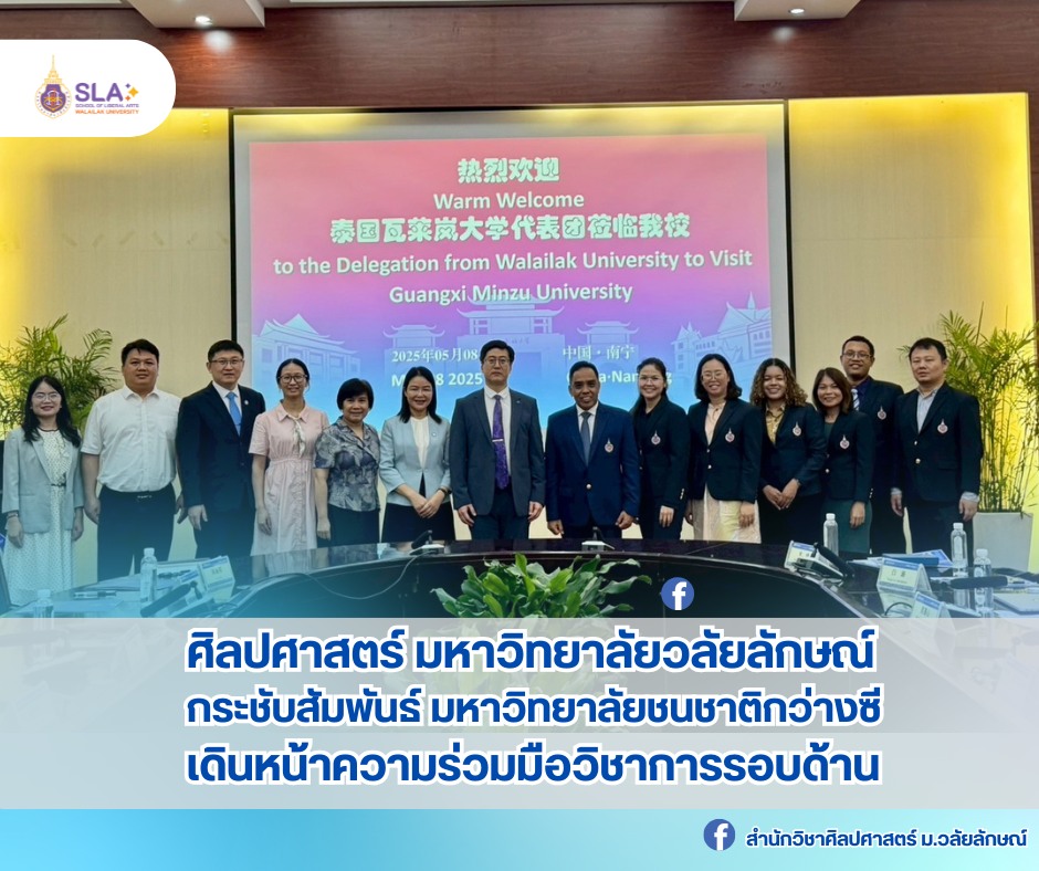วันที่ 8 พฤษภาคม 2568 เวลา 09:00-14:00 น. ณ มหาวิทยาลัยชนชาติกว่างซี (Guangxi Minzu University: กวางสี) นครหนานหนิง มณฑลกวางสี สาธารณรัฐประชาชนจีน คณะผู้บริหารและคณาจารย์จากสำนักวิชาศิลปศาสตร์ มหาวิทยาลัยวลัยลักษณ์ ได้เดินทางเข้าร่วมการประชุมหารือเพื่อเสริมสร้างความสัมพันธ์และขยายขอบเขตความร่วมมือทางวิชาการกับผู้บริหารของมหาวิทยาลัยชนชาติกว่างซี