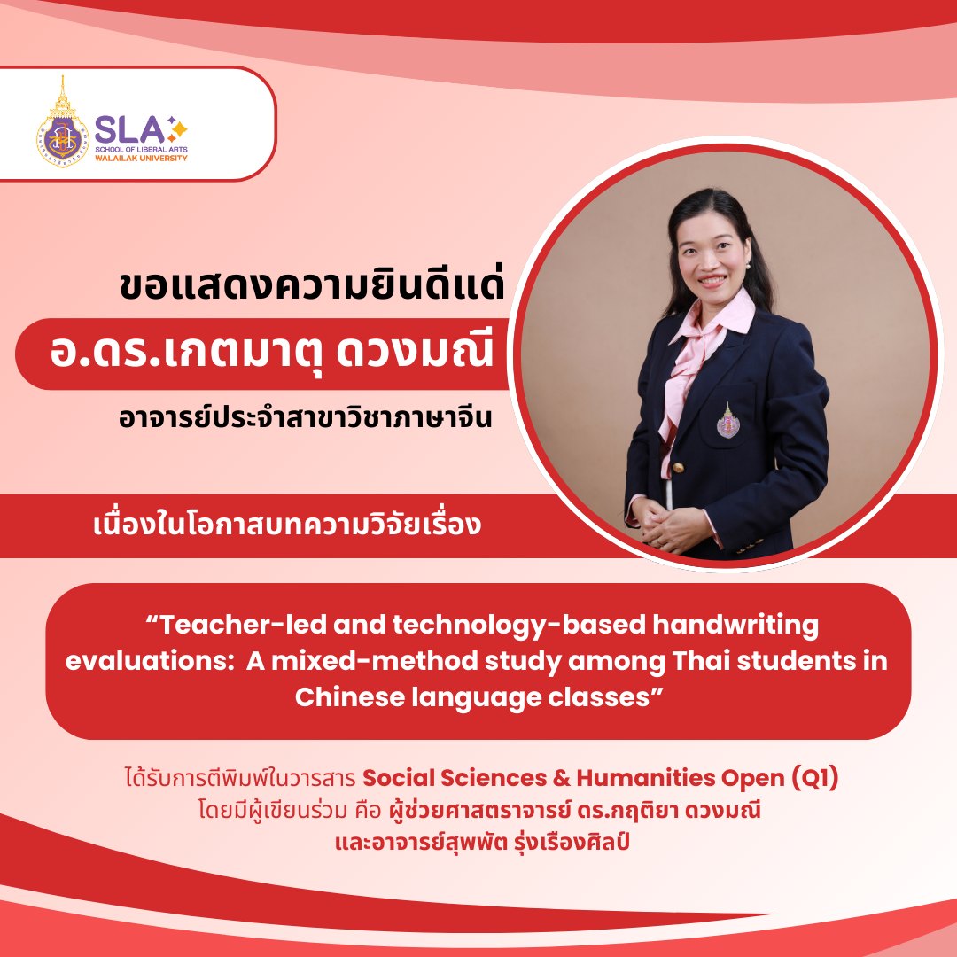 เนื่องในโอกาสที่บทความวิจัยเรื่อง “Teacher-led and technology-based handwriting evaluations: A mixed-method study among Thai students in Chinese language classes” ได้รับการพิจารณาตีพิมพ์ในวารสาร Social Sciences & Humanities Open (Q1) โดยมีผู้เขียนร่วม คือ ผู้ช่วยศาสตราจารย์ ดร.กฤติยา ดวงมณี และอาจารย์สุพพัต รุ่งเรืองศิลป์