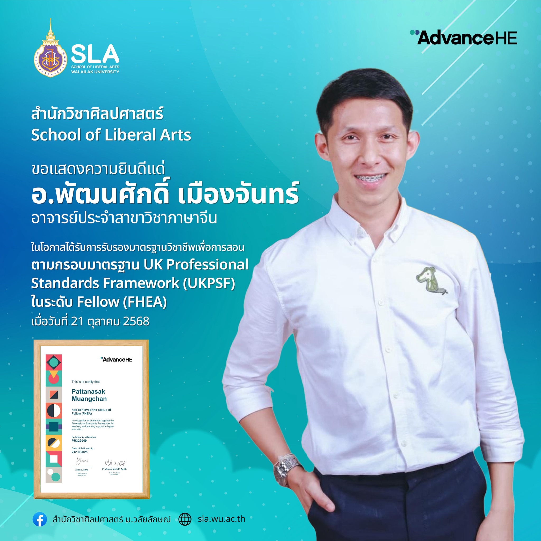 ในโอกาสที่ได้รับการรับรองมาตรฐานวิชาชีพเพื่อการสอนตามกรอบมาตรฐาน The United Kingdom Professional Standards Framework (UKPSF) จาก Advance HE ประเทศอังกฤษ ในระดับ Fellow (FHEA)