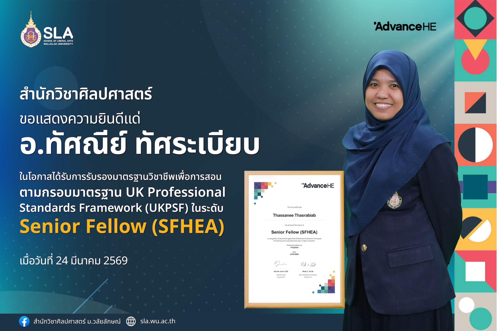 School of Liberal Arts, Walailak University is pleased to extend its warmest congratulations to Ajarn Thassanee Thasrabiab Acting Head of the English Program on being awarded professional recognition under the UK Professional Standards Framework (UKPSF)