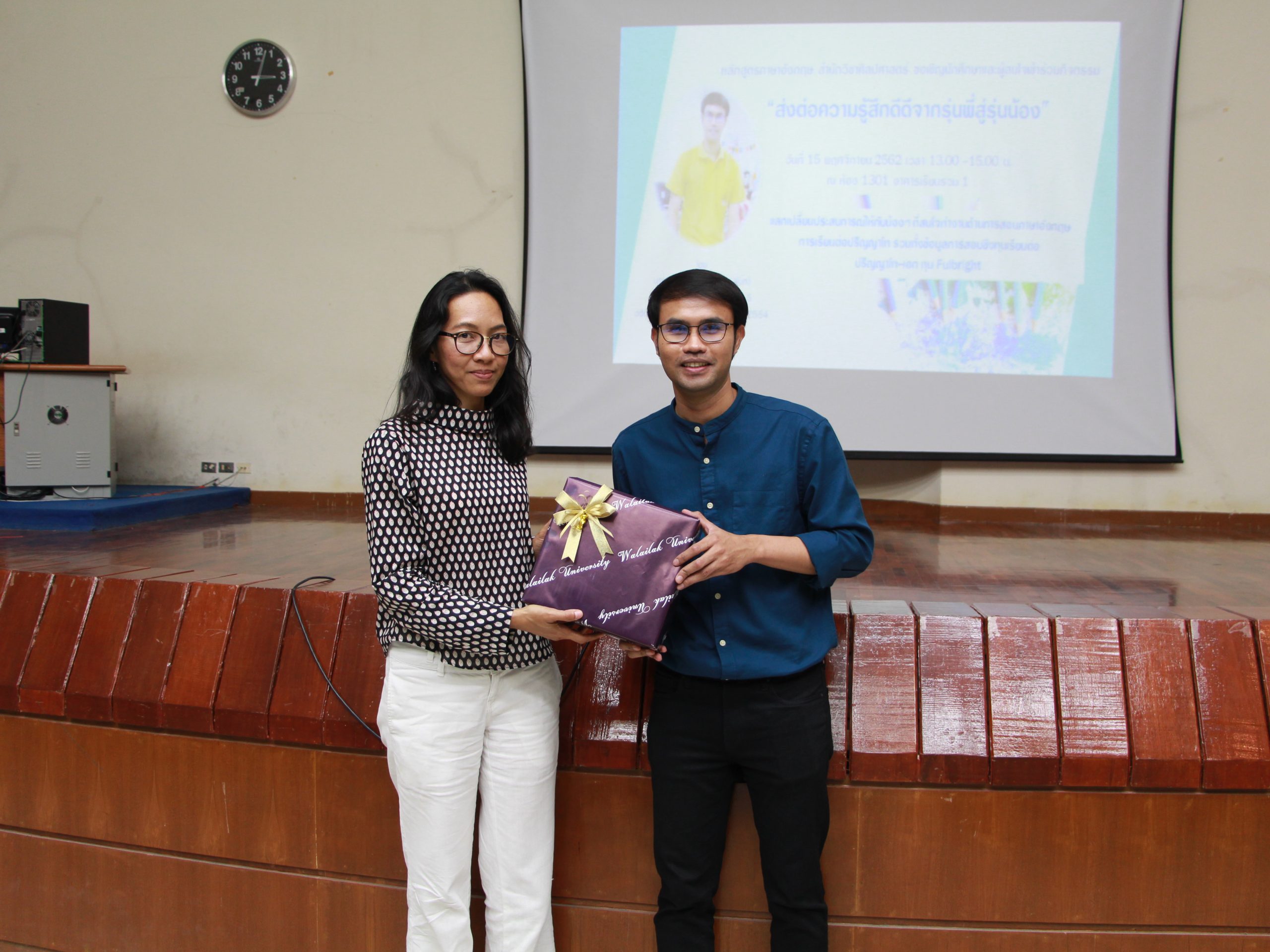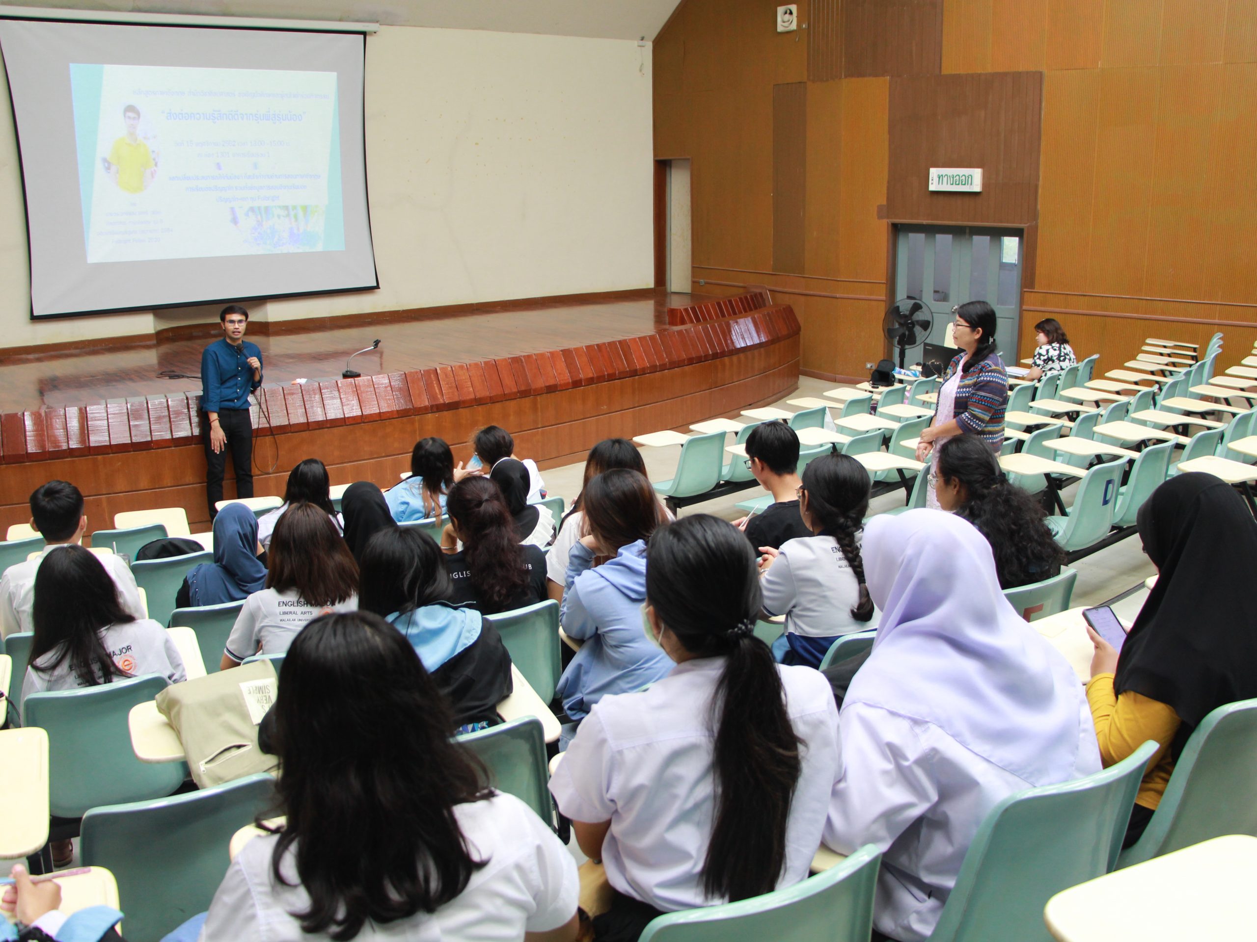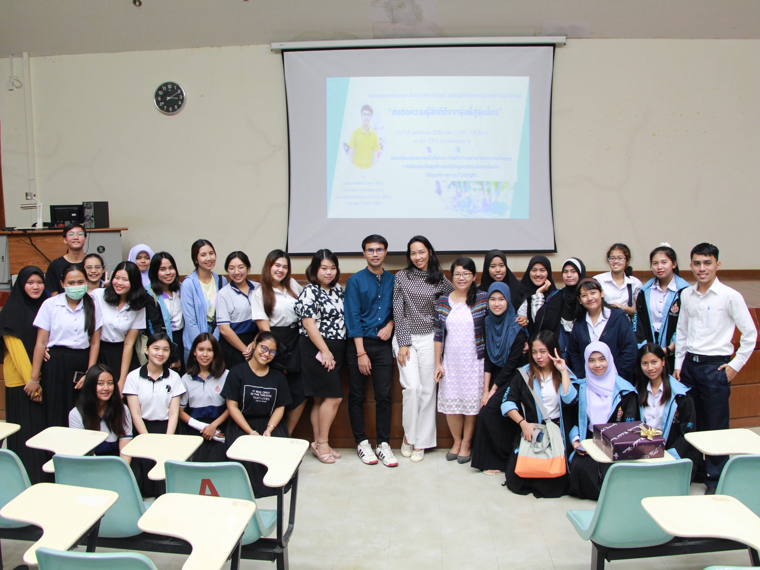 On 15th November 2019, English Program, School of Liberal Arts arranged “Special Talk from Senior to Junior Students” on the topic “Transferring good feeling from seniors to juniors”. The activity mainly aimed to exchange experiences to juniors who are interested in either teaching English or furthering their study in the master degree. In addition, there was some updated news about scholarships in both master and doctoral degree as well as Fulbright Scholarship. Aj. Worawetpisit Yotsiri (the 5th Alumni of School of Liberal Arts, student in government scholarship 2011 and Fulbright Fellow 2020), currently has been teaching as the lecturer in English Program, Faculty of Humanities and Social Sciences, Yala Rajabhat University. It was really wonderful opportunity to all students that Aj. Worawetpisit shared his precious experiences while he was studying in the university and inspired juniors to be able to achieve successful study life and bright career path in the future.