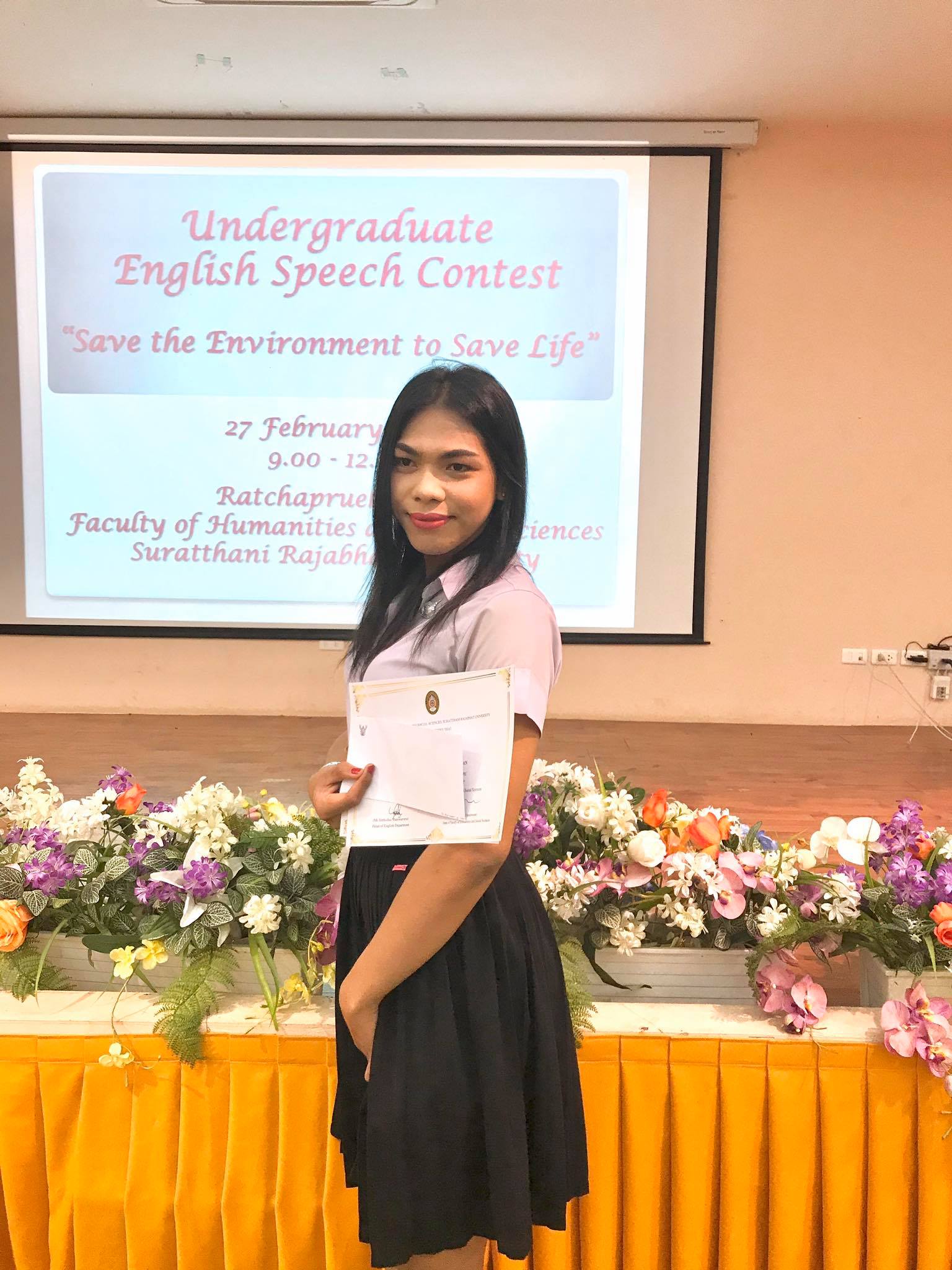 ขอแสดงความยินดีกับ นายดำรงศักดิ์ รัตนสุวรรณ นักศึกษาหลักสูตรภาษาอังกฤษ ชั้นปีที่ 3 ที่คว้ารางวัลรองชนะเลิศอันดับ 1 จากการประกวดสุนทรพจน์ภาษาอังกฤษระดับอุดมศึกษา ในหัวข้อ “Save the Environment to Save Life” ที่สาขาวิชาภาษาอังกฤษ คณะมนุษยศาสตร์และสังคมศาสตร์ มหาวิทยาลัยราชภัฏสุราษฎร์ธานี เป็นเจ้าภาพจัดการแข่งขัน เมื่อวันที่ 27 กุมภาพันธ์ 2563 ณ ห้องประชุมราชพฤกษ์ ชั้น 2 อาคารเฉลิมพระเกียรติ 84 พรรษา คณะมนุษยศาสตร์และสังคมศาสตร์ มหาวิทยาลัยราชภัฏสุราษฎร์ธานี