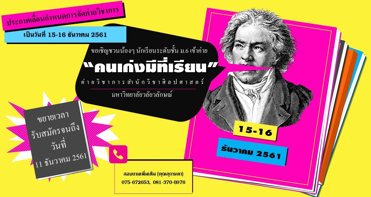 ขอแจ้งเลื่อนกำหนดการจัดโครงการค่ายวิชาการสำนักวิชาศิลปศาสตร์ “คนเก่งมีที่เรียน” อ่านต่อ » ธันวาคม 2, 2018